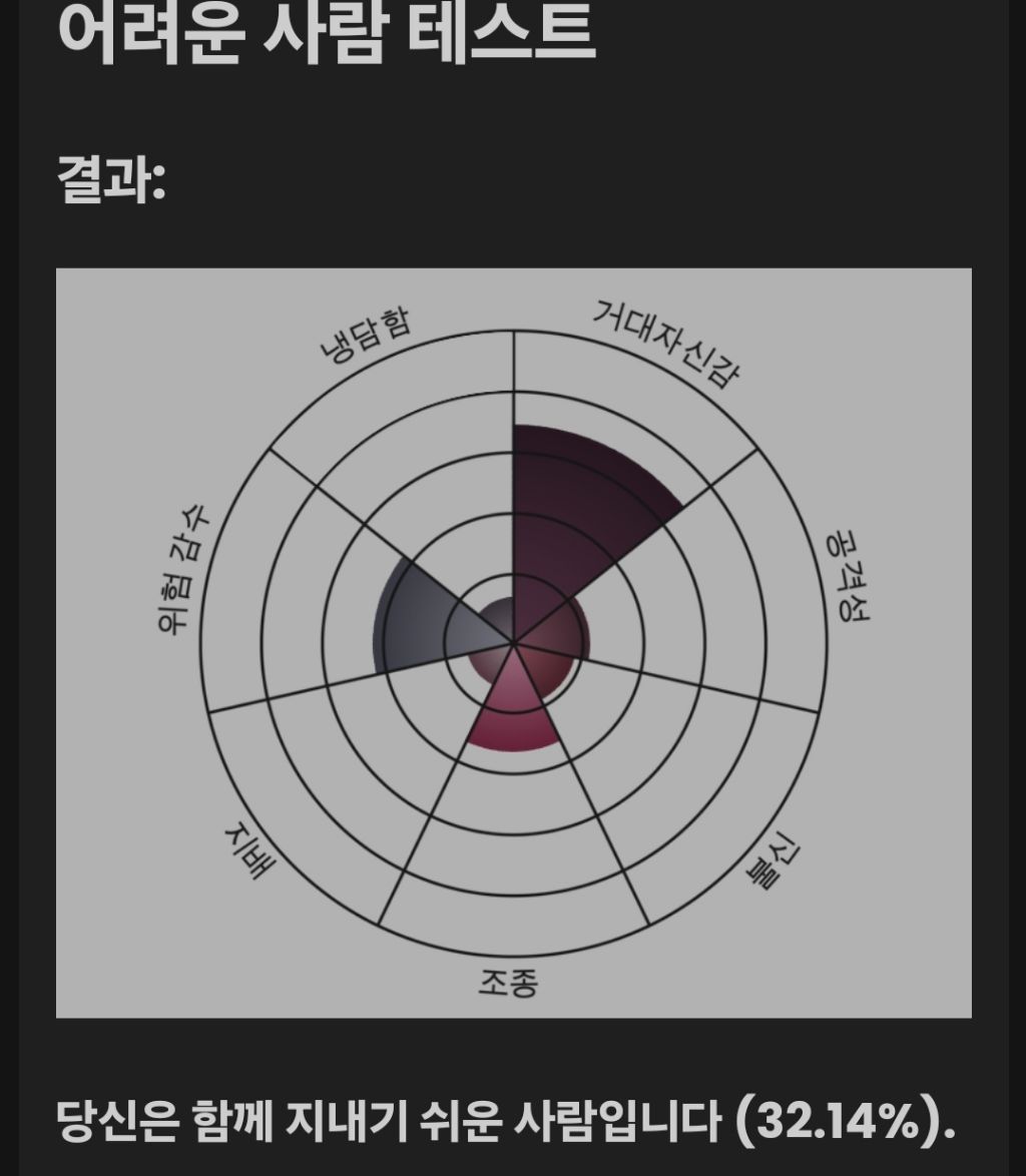 [기타]트위터 화제인 어려운 사람 테스트 작성자왓차욋차|작성시간25.11.15|조회수16,099 목록 댓글 141 글자크기 작게가 글자크기 크게가 출처: https://www.idrlabs.com/kr/difficult-person/test.php어려운 사람 테스트당신이 함께 지내기 쉬운지, 혹은 어려운지에 대해 판별할 수 있는 어려운 사람 테스트www.idrlabs.com난 이거 나옴 다음검색 현재 게시글 추가 기능 열기 북마크 공유하기 신고 센터로 신고 댓글 댓글 141 댓글쓰기 답글쓰기 댓글 리스트 작성자도톰한 엠보 물티슈 | 작성시간 25.11.16 전 굉장히 특별한 사람이고 남들 기분따위 신경쓰지 않는다내요 이미지 확대 작성자닉넴뭐다 | 작성시간 25.11.16 공격성은 높은데 사람에 대한 불신은 낮다고?신뢰하는 사람이라도 언제든 공격할 수 있단 말이니까나 되게 이상한 사람이네 ㅋㅋㅋㅋㅋㅋ반성하게 된다 이미지 확대 작성자springSummer | 작성시간 25.11.16 ㅋㅋㅋㅋㅋ신기하다 작성자엔초건들지마 | 작성시간 25.11.16 공격성 어떻게 줄여요..? 이미지 확대 작성자소마엘 | 작성시간 25.11.19 냉담함 뭐여요 ㅠ 이미지 확대 댓글 전체보기