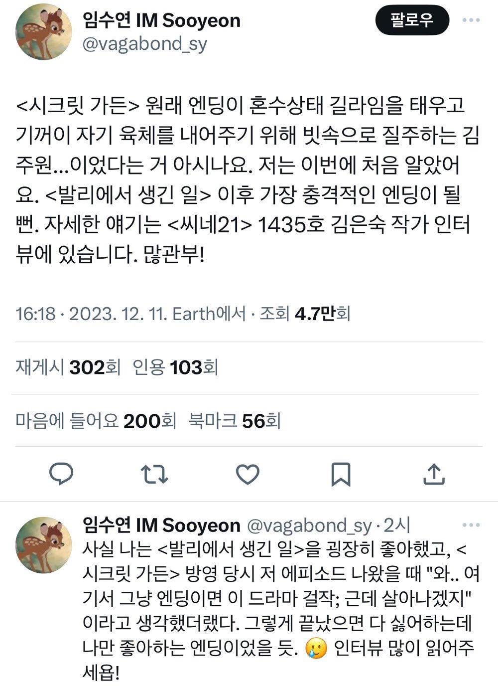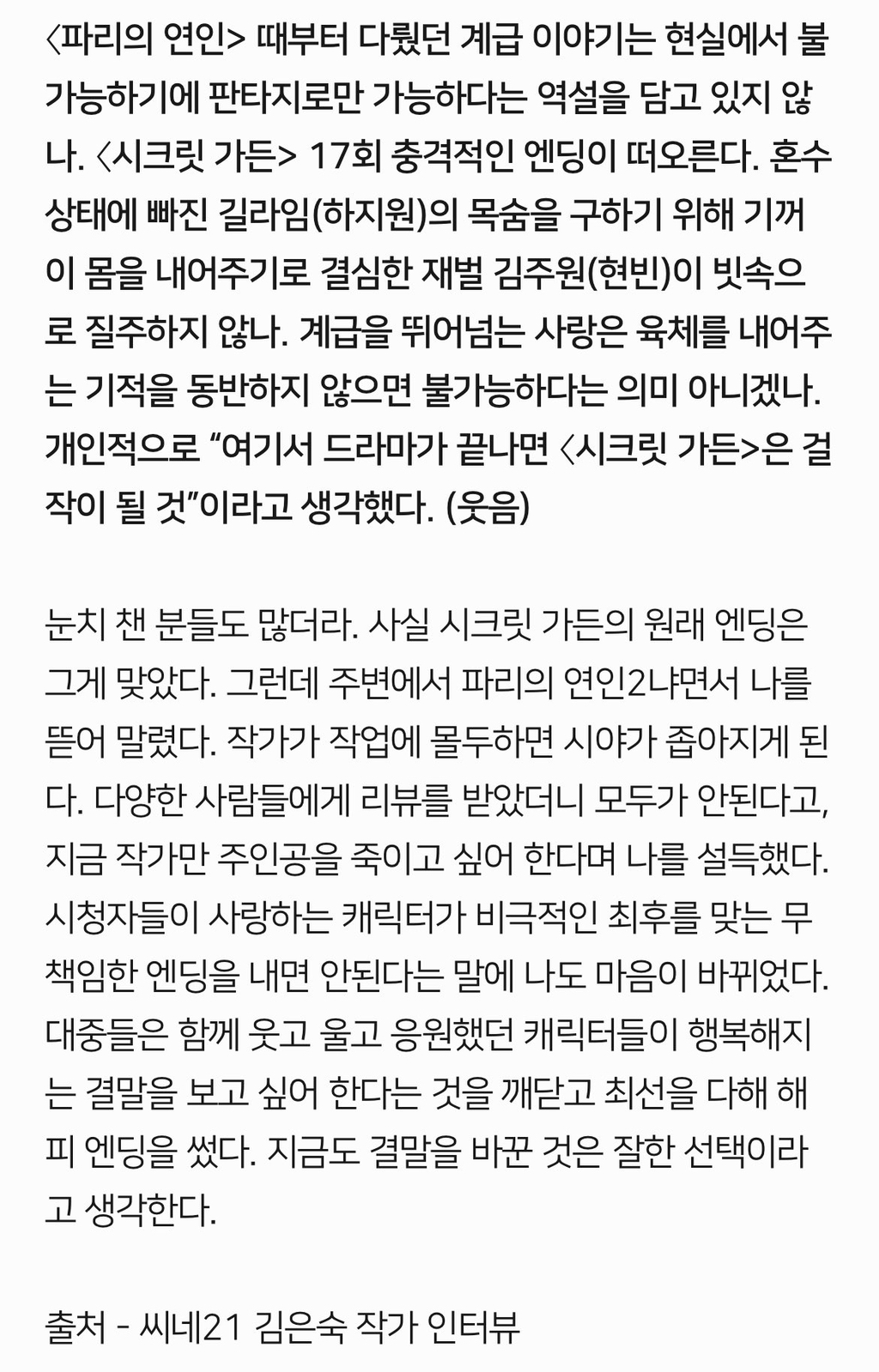 작성자이킁에킁 작성시간 25.11.16 저 결말도 좋지만 해피엔딩이 더 좋아