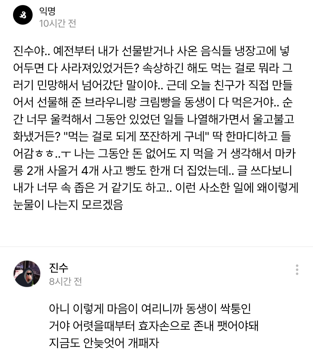 나도 맨날 내가 먹으려고사둔거 쪽지써붙이고 먹지말라고 했는데 동생이 먹어서 진짜 난리지랄을 떨었더니 이제는 냉장고에 쪽지안붙이고 갔다놔도 가족들 아무도 안건드리더라