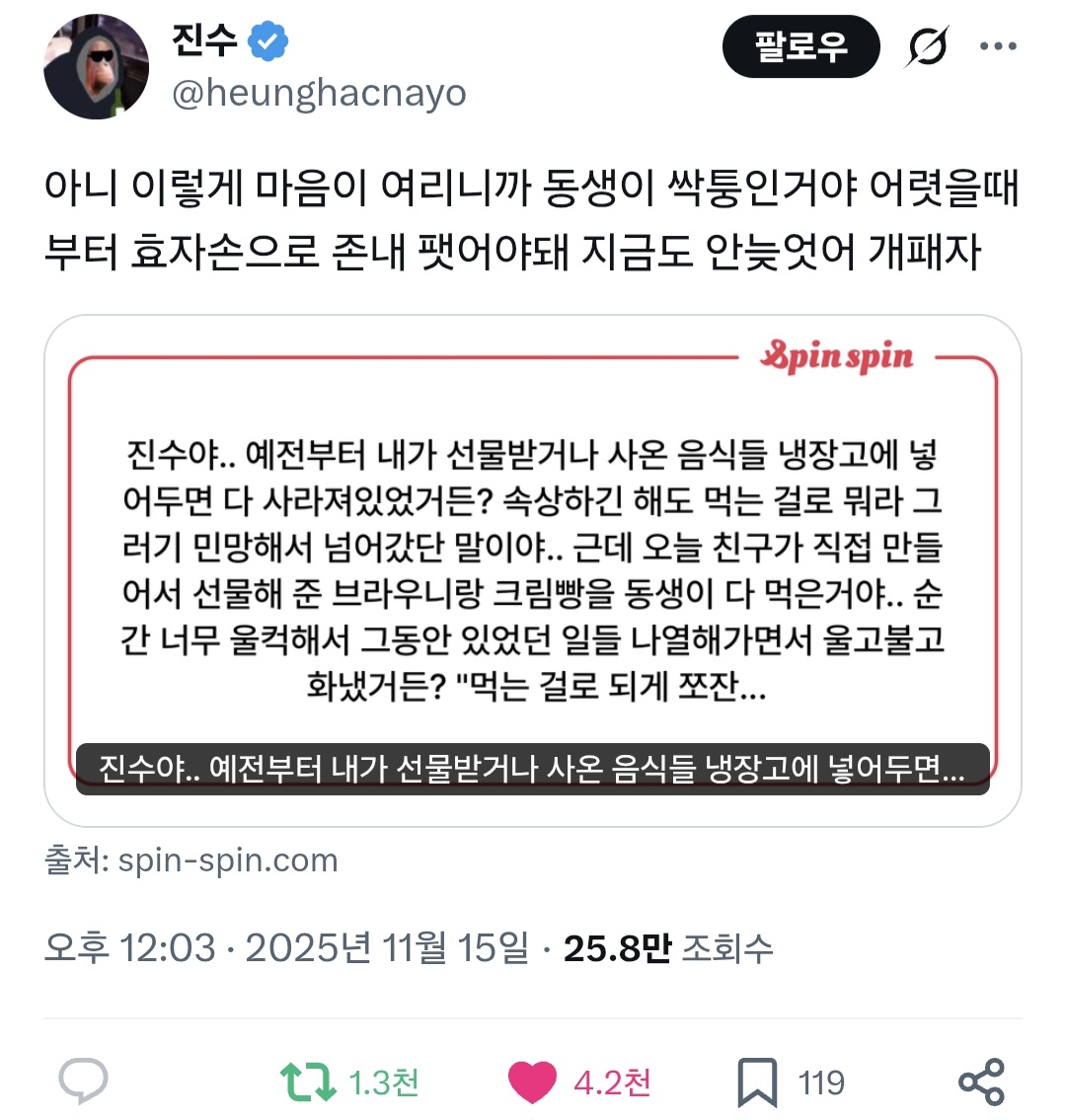 작성자쿠릉 작성시간 25.11.16 동생 개패야지진짜