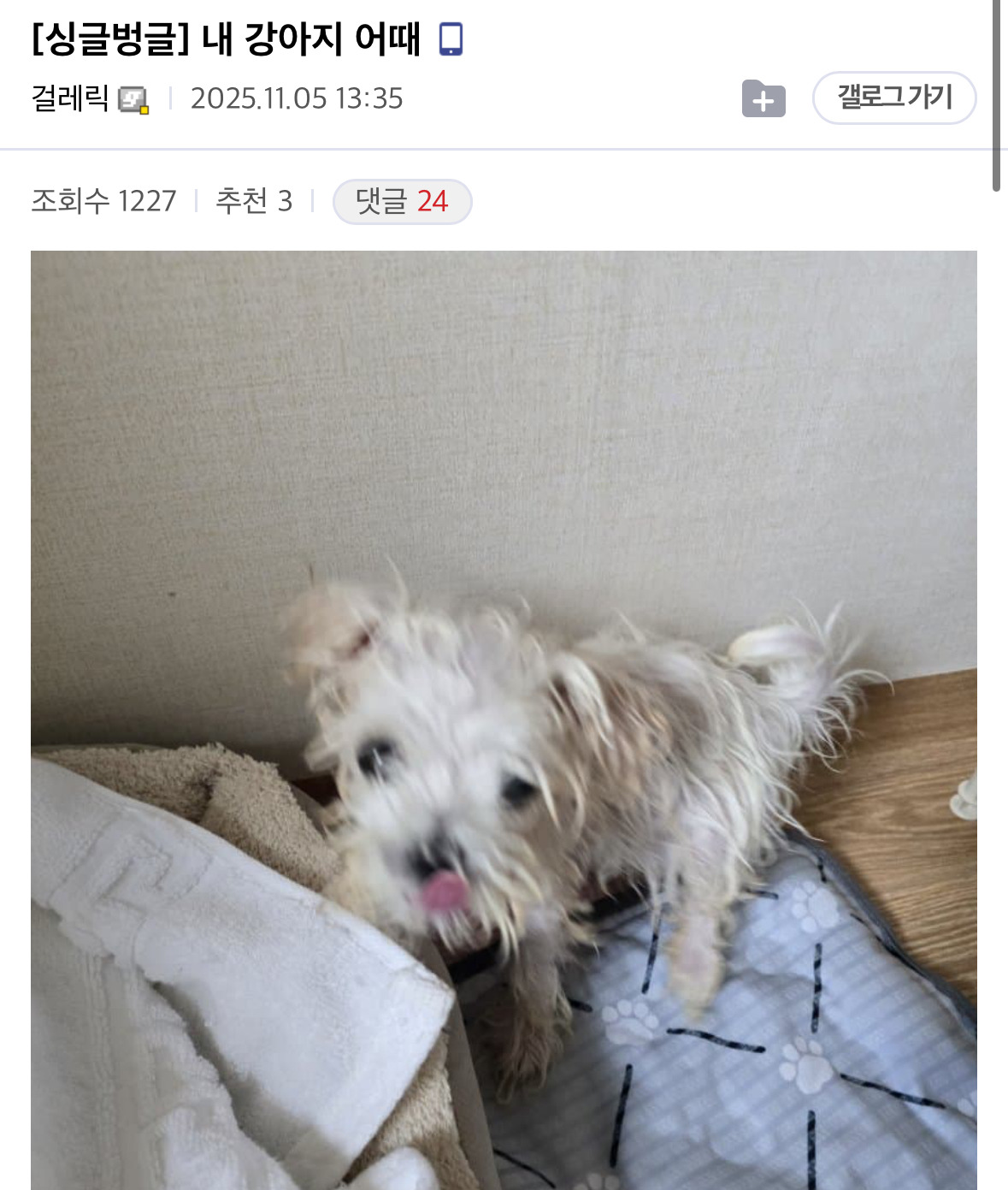 [흥미돋]내 강아지 어때 작성자폼폼부린|작성시간25.11.15|조회수20,657 목록 댓글 42 글자크기 작게가 글자크기 크게가 출처: 여성시대 폼폼부린(내강아지아님)귀여운데ㅜㅜ 다음검색 현재 게시글 추가 기능 열기 북마크 공유하기 신고 센터로 신고 댓글 댓글 42 댓글쓰기 답글쓰기 댓글 리스트 작성자프리티포 | 작성시간 25.11.15 닉값한대서 닉봤더니.... 너무해 ㅠㅠㅠ 귀여운데 ㅠ 작성자대통렁 | 작성시간 25.11.15 ㅋㅋㅋㅋㅋㅋ큐ㅠㅠ 작성자말랭Ol | 작성시간 25.11.15 젖은거같은데 ㅋㅋㅋㅋ 씻고나온거같아 작성자산딸기딸기 | 작성시간 25.11.16 너무기야웅 작성자Moleskine | 작성시간 25.11.16 제발 사진 더요 제발 댓글 전체보기
