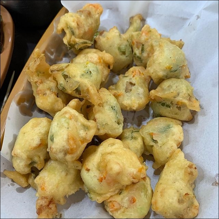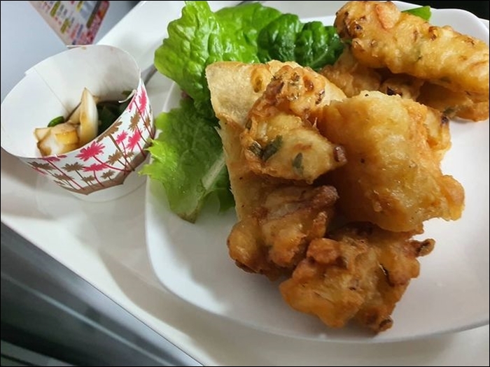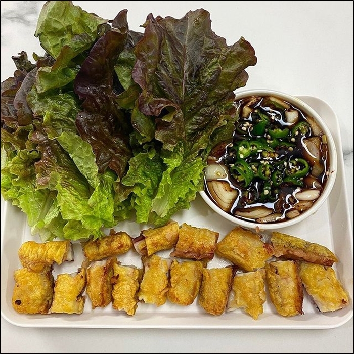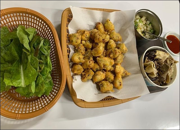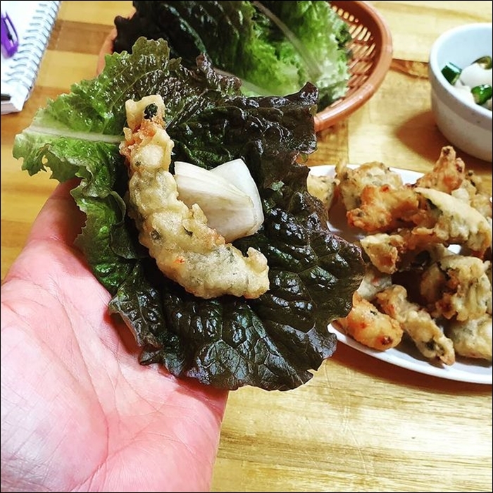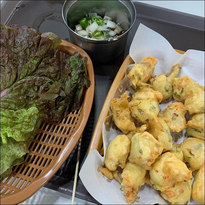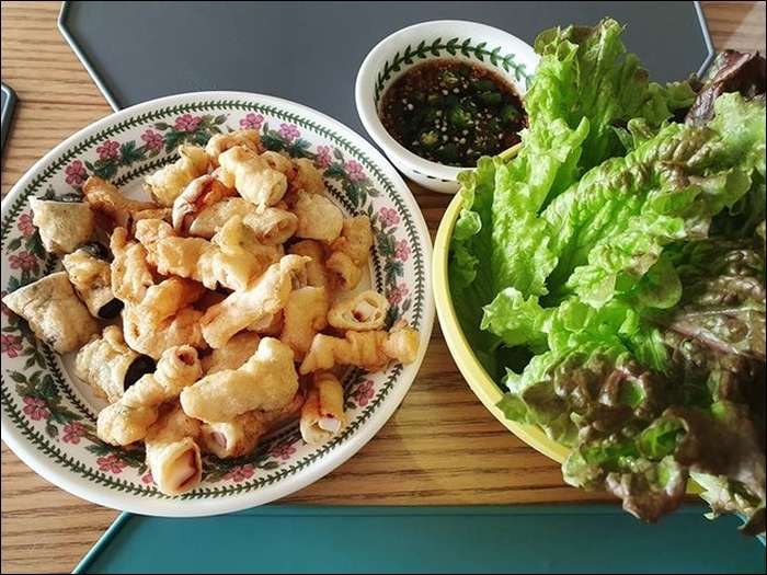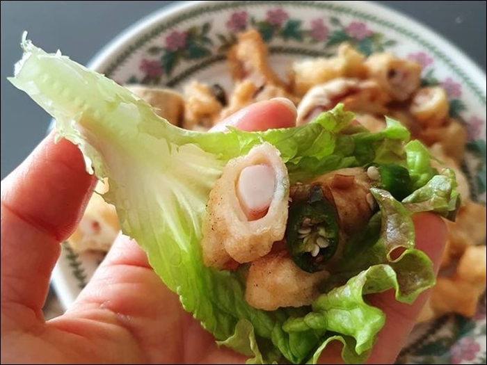상추를 튀긴게 아니라 바삭한 튀김을 상추위에 얹고