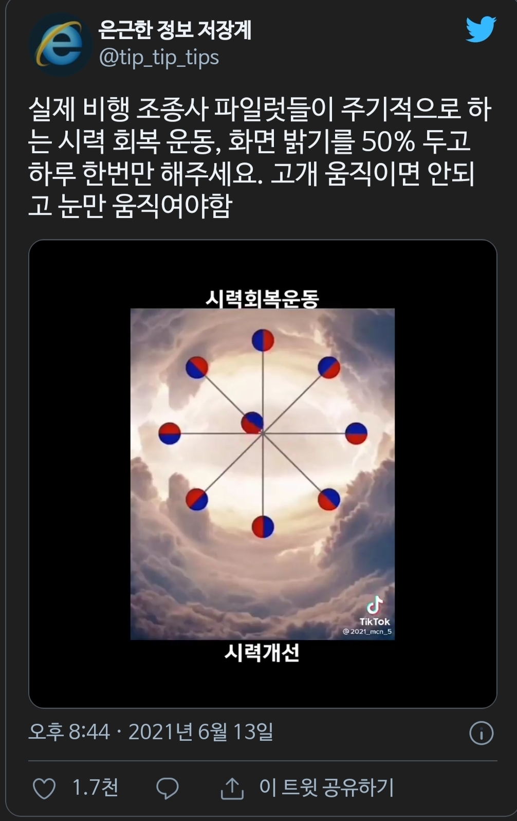 [스크랩] [흥미돋]실제 비행 조종사 파일럿들이 주기적으로 하는 시력 회복 운동.twt 작성자자라고잇다|작성시간25.11.16|조회수11,022 목록 댓글 4 글자크기 작게가 글자크기 크게가 출처 : https://twitter.com/tip_tip_tips/status/1404041864571801602?s=19 다음검색 스크랩 원문 : *여성시대* 차분한 20대들의 알흠다운 공간 현재 게시글 추가 기능 열기 북마크 공유하기 신고 센터로 신고 댓글 댓글 4 댓글쓰기 답글쓰기 댓글 리스트 작성자쓰박 | 작성시간 25.11.16 나 왜 눈이 시리냐.. 답댓글 작성자crwl | 작성시간 25.11.16 ㄴㄷ 안구건조잇..ㅋㅋㅋ 작성자20세기미술사 | 작성시간 25.11.16 어우 눈알피곤해 작성자GIANTS | 작성시간 25.11.17 이거 화면 굳이 안보고 걍 눈동자 저 방향들로 움직이기만 해도 된댓음내친구 1년 가까이 진짜 꼬박꼬박 했는데 시력 좋아졌다고 나한테도 하라더라ㅠ자기 어머니가 먼저 하고 좋아서 했다면서 댓글 전체보기