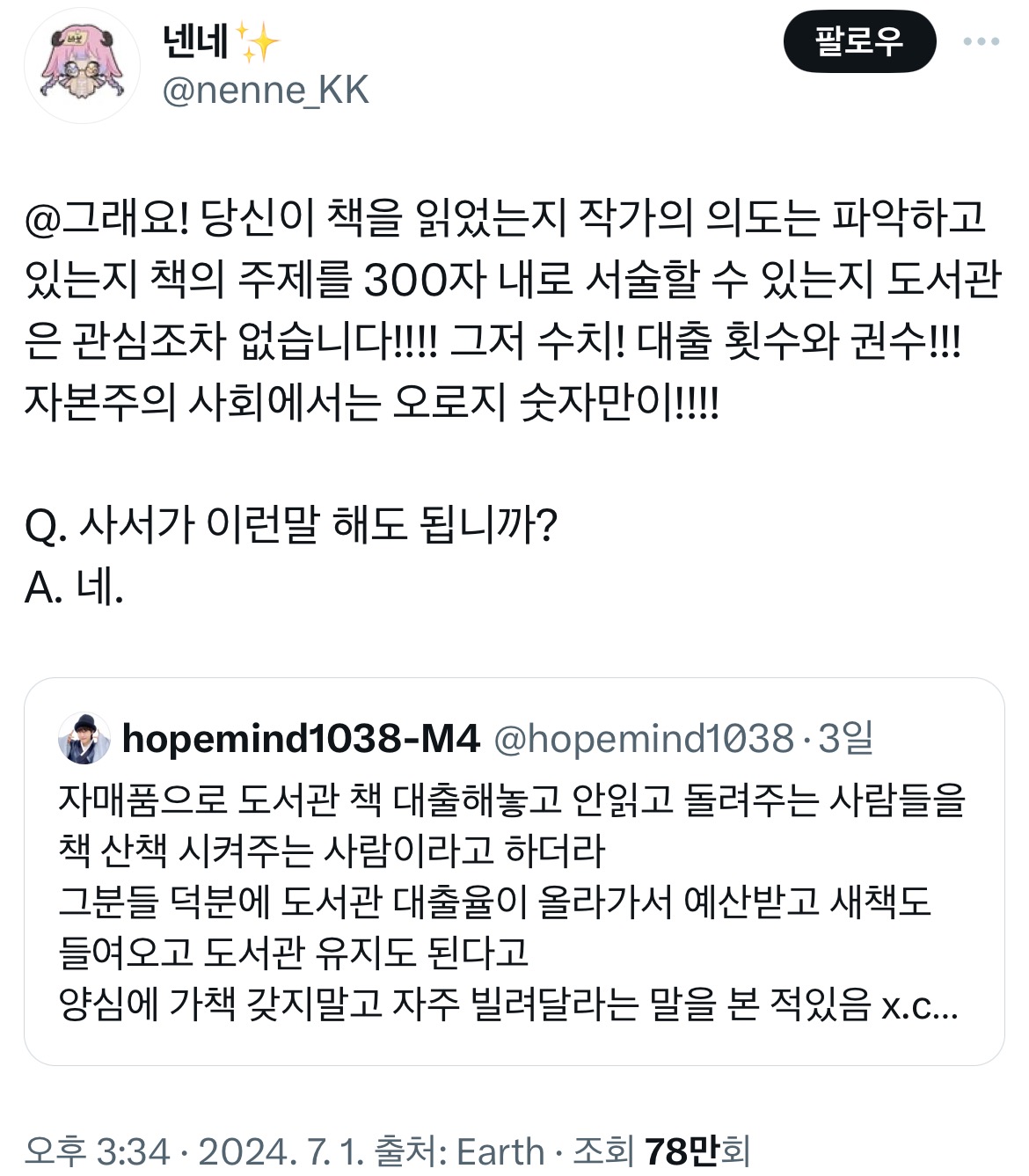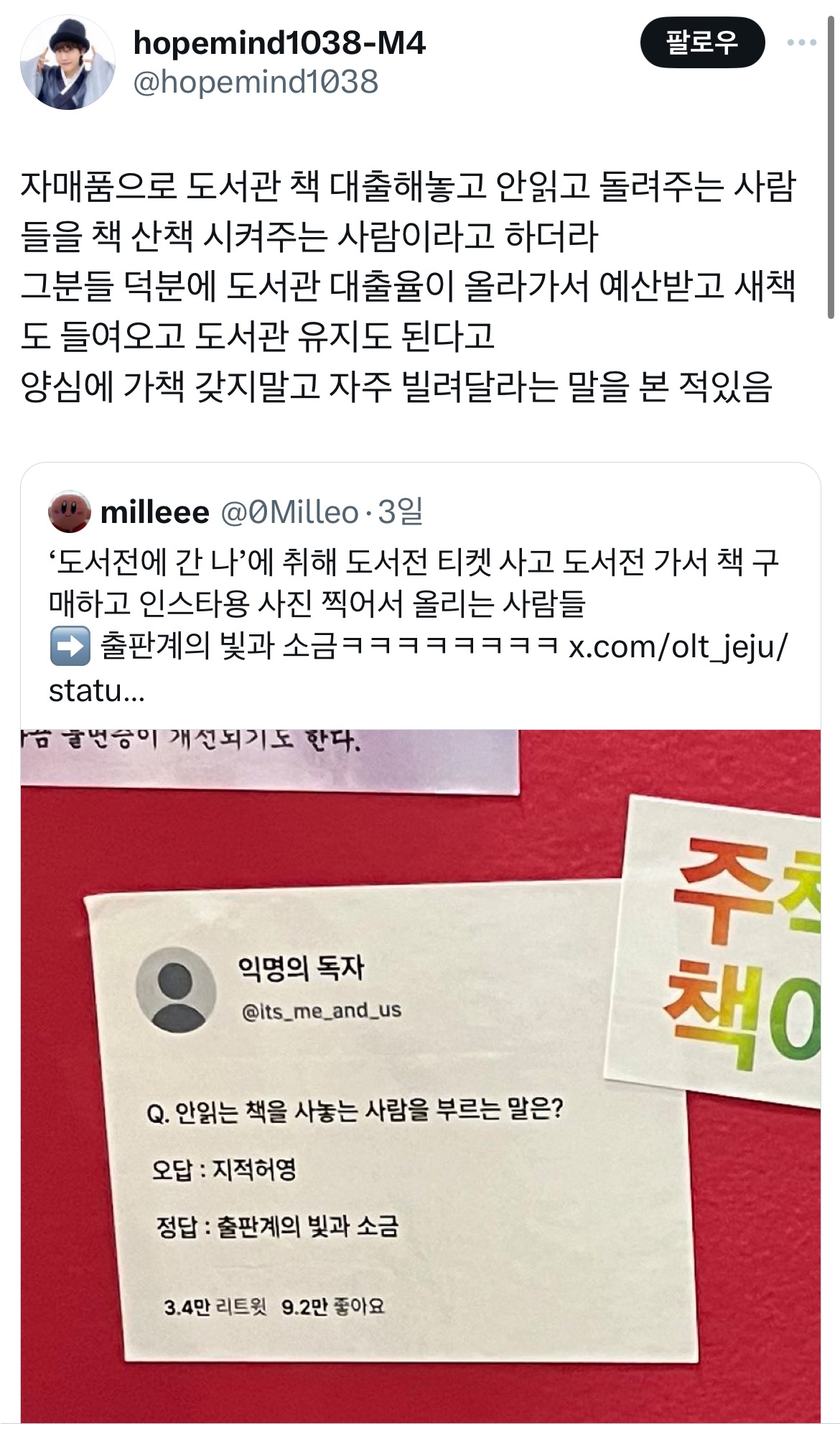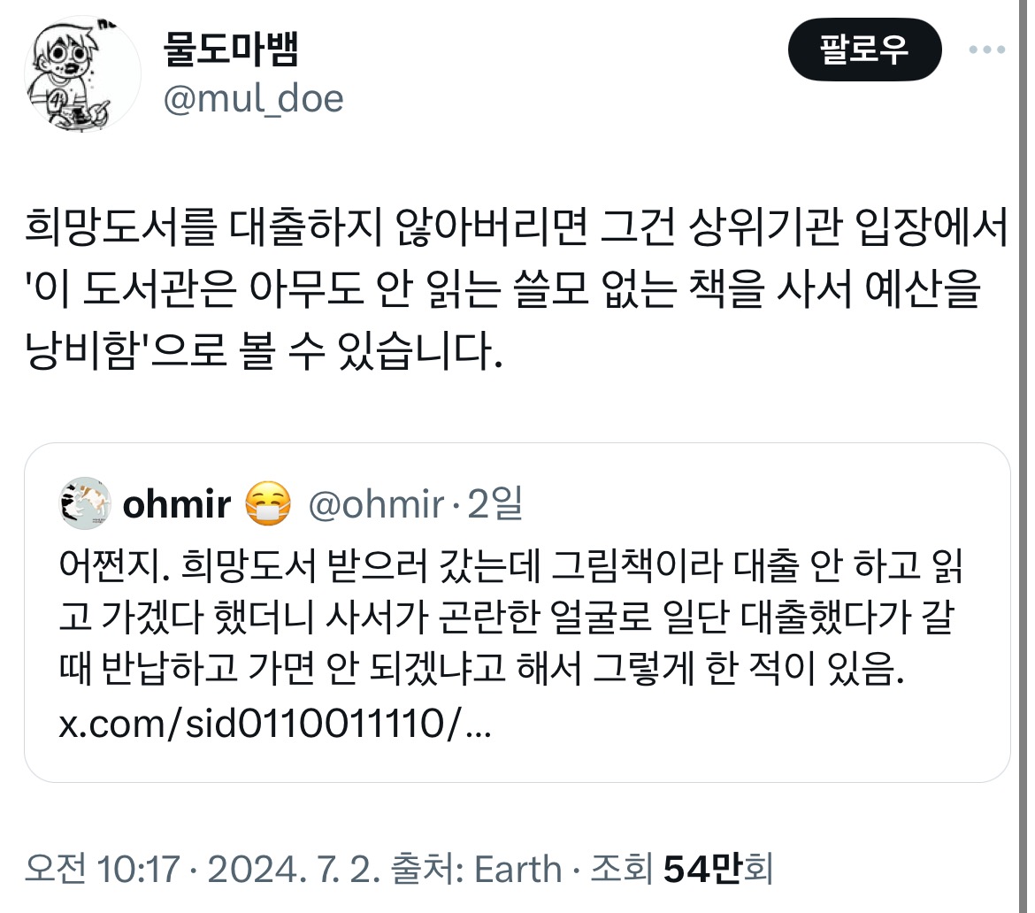 [스크랩] [흥미돋]도서관 책 산책시켜주는 사람들.x 작성자푸팟퐁커리볶음면|작성시간25.11.16|조회수14,224 목록 댓글 23 글자크기 작게가 글자크기 크게가 출처: https://x.com/hopemind1038/status/1807368611264381311?s=46&t=KlDqBlNqBJ3fwIZTZ3FsOg책 산책시켜주러 가야겠다 다음검색 스크랩 원문 : *여성시대* 차분한 20대들의 알흠다운 공간 현재 게시글 추가 기능 열기 북마크 공유하기 신고 센터로 신고 댓글 댓글 23 댓글쓰기 답글쓰기 댓글 리스트 작성자층간소음충은뒤져 | 작성시간 25.11.16 난 책은 무거워서 이젠 힘들고 이북리더기 산책 시켜줌 작성자그런 일로 전화하지 마세요 | 작성시간 25.11.16 한번에 8권씩 데려온다죠 작성자프로젝트레인보우 | 작성시간 25.11.16 스마트 도서관도 포함인가? 여러 도서관 책들이 섞여 있던데 작성자혼술 | 작성시간 25.11.16 나 잘하고 잇엇네... 작성자꼬질미 | 작성시간 25.11.16 나야나 한달에 서너권씩 산책시킨다죠 댓글 전체보기
