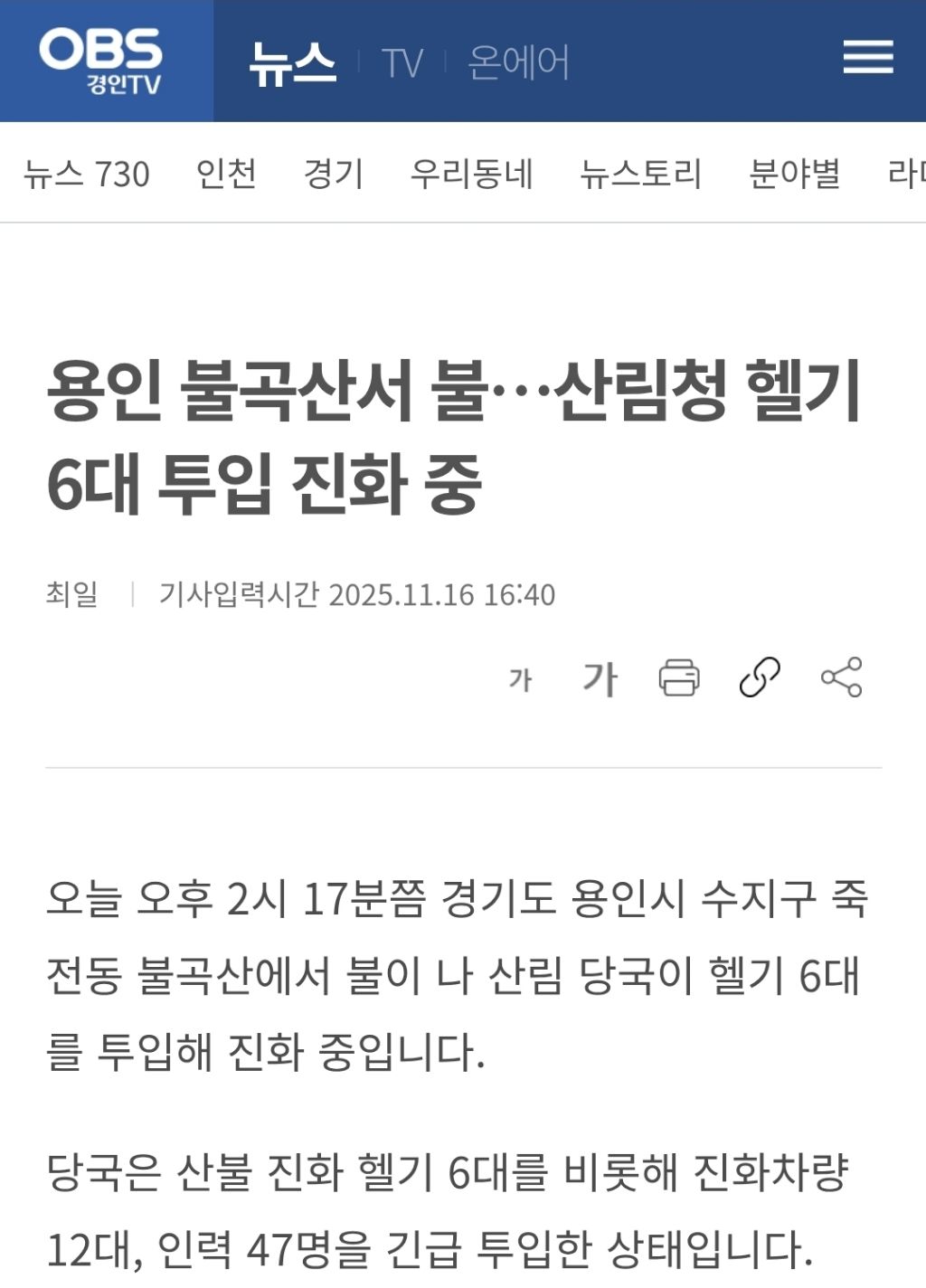 [여시뉴스데스크]용인 불곡산서 불…산림청 헬기 6대 투입 진화 중 작성자여단오여|작성시간25.11.16|조회수3,448 목록 댓글 2 글자크기 작게가 글자크기 크게가 출처: https://www.obsnews.co.kr/news/articleView.html?idxno=1504028용인 불곡산서 불…산림청 헬기 6대 투입 진화 중 - 최일 기자오늘 오후 2시 17분쯤 경기도 용인시 수지구 죽전동 불곡산에서 불이 나 산림 당국이 헬기 6대를 투입해 진화 중입니다.당국은 산불 진화 헬기 6대를 비롯해 진화차량 12대, 인력 47명을 긴급 투입www.obsnews.co.kr 다음검색 현재 게시글 추가 기능 열기 북마크 공유하기 신고 센터로 신고 댓글 댓글 2 댓글쓰기 답글쓰기 댓글 리스트 작성자안다은 | 작성시간 25.11.16 얼른 꺼주세요ㅠㅠ 작성자니꼬동제련워딩금지 | 작성시간 25.11.16 ㅠ 헬기 열심히 가드라.. 진화되었길 ㅠ 댓글 전체보기
