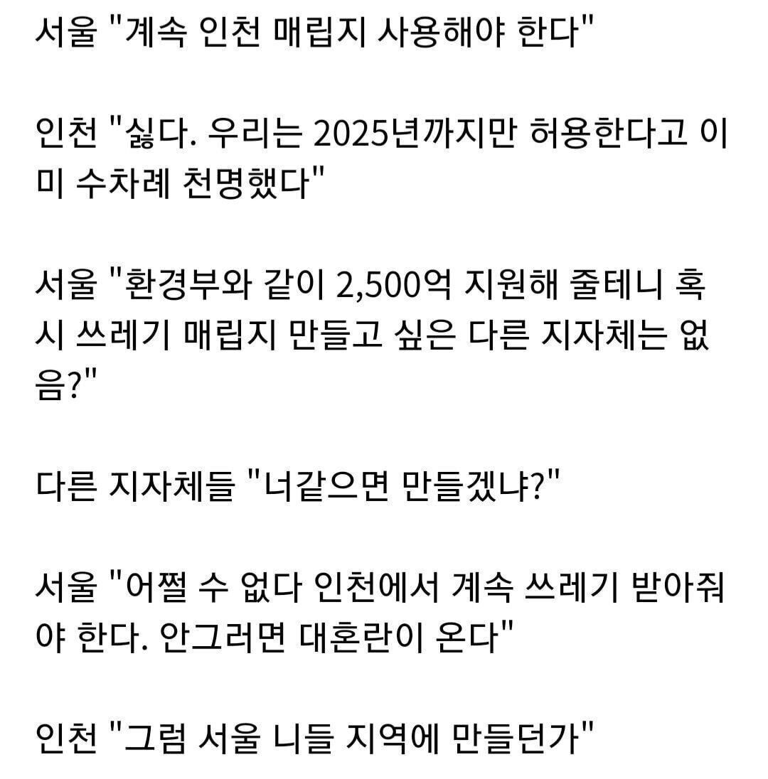 [스크랩] [흥미돋]2025년 수도권 쓰레기 매립지 종료 작성자p9i7y5r3w1|작성시간25.11.16|조회수28,211 목록 댓글 319 글자크기 작게가 글자크기 크게가 저도 서울 살지만서울 쓰레기는 서울에서 처리해야 하는게 당연한 거 아닌가요. 다음검색 스크랩 원문 : 樂soccer 현재 게시글 추가 기능 열기 북마크 공유하기 신고 센터로 신고 댓글 댓글 319 댓글쓰기 답글쓰기 댓글 리스트 작성자할수있쒀 | 작성시간 25.11.18 진짜 기분나빠 인천사는데ㅜ 작성자엽뗙사랑 | 작성시간 25.11.18 서울에 만들어서 미친 집값 좀 잡아야지 작성자달콤한 솜주먹 | 작성시간 25.11.18 한강에ㄱㄱ 한강버스 할돈이면 진작에 만들엇겠다 작성자행복은 곧 길이다 | 작성시간 25.11.18 인천이 쓰레기통이냐? 서울 쓰레기는 서울에서 처리하도록 작성자2025년대박나다 | 작성시간 25.11.19 서울에 만들어 쫌 댓글 전체보기
