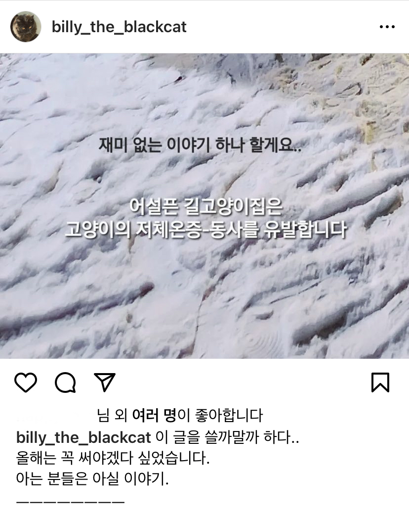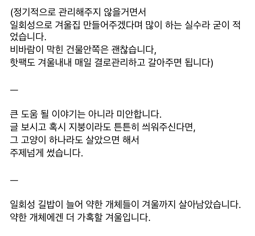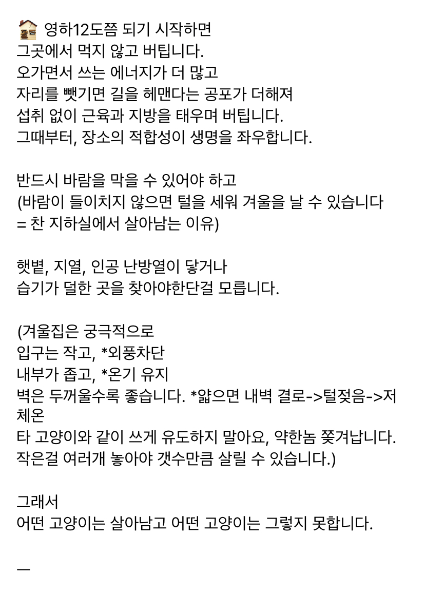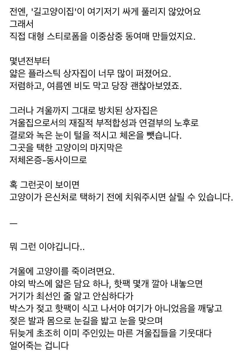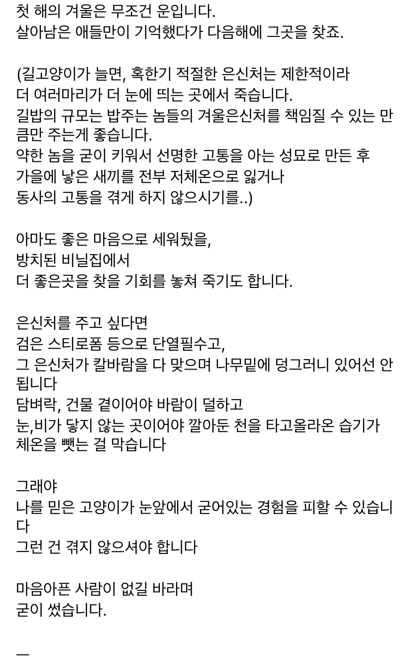 작성자뭐믈레 작성시간 25.11.16 이거 예전에보고나서 우리 집근처 며칠 신경쓰면서 봤는데 고양이 챙겨주시는 분들 진짜 정성 장난 아니더라...몇분이서 타임정해서 밥 물 갈아주는것 같고 집도 플라스틱집 아니고 그냥 너무 대단했음 올해도 길친구들 겨울 잘 나면 좋겠다