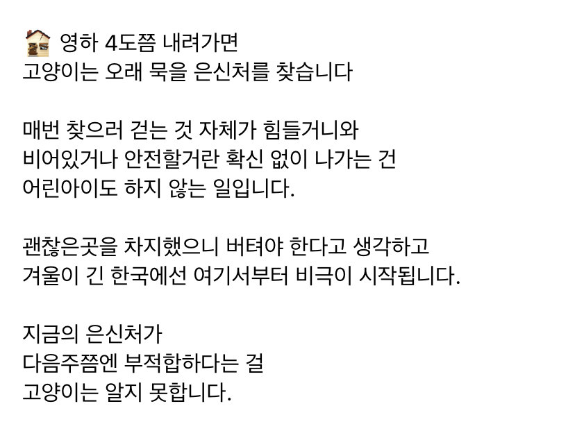 작성자blanc et 작성시간 25.11.17 나 고보협거에 방한재 방풍재 뽁뽁이 다붙여서 만들엇는데 울동네 냥이 누가 케이지에 넣어서 중성화하러 잡혀갓다오고 병원다녀온 후로