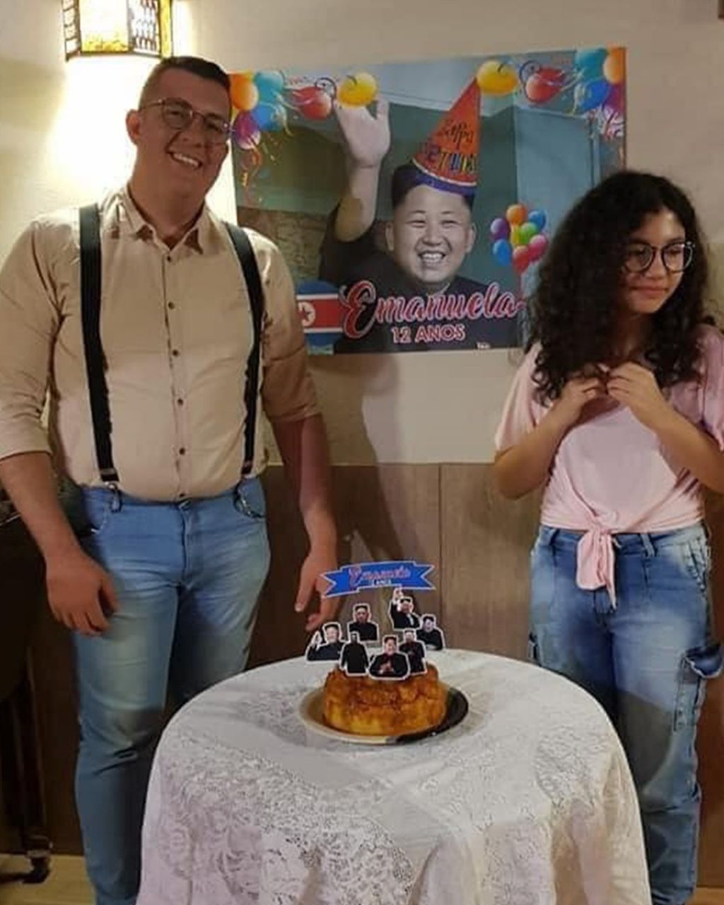 결국 파티장은 김정은 얼굴이 인쇄된 케이크와 포스터로 가득 찼다. 여동생은 어이없는 표정을 지었고, 그 장면은 SNS를 통해 전 세계로 퍼졌다.