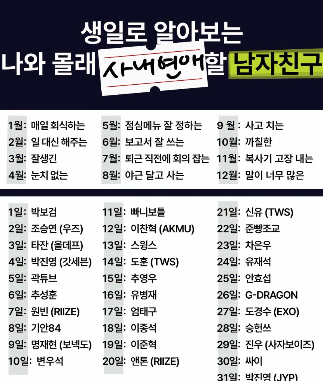 [흥미돋]생일로 알아보는 나와 몰래 사내연애 할 남자친구 작성자시간참빨라|작성시간25.11.16|조회수25,785 목록 댓글 303 글자크기 작게가 글자크기 크게가 출처: https://theqoo.net/square/3994148134 다음검색 현재 게시글 추가 기능 열기 북마크 공유하기 신고 센터로 신고 댓글 댓글 303 댓글쓰기 답글쓰기 댓글 리스트 작성자개가티성공한다 | 작성시간 25.11.19 후....말이너무많은 곽튜브..? 작성자위가튼튼해야산다 | 작성시간 25.11.20 퇴근직전에 회의잡는 스윙스...?ㅆㅂ/// 작성자치이이키이인 | 작성시간 25.11.20 준빵조교??? 샤갈 작성자먹밥쿵야 | 작성시간 25.11.21 까칠 차은우 작성자나사 | 작성시간 25.12.05 23일에 태어난 여시들 부럽다 댓글 전체보기