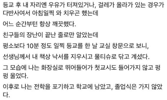작성자털뿡이들 작성시간 25.11.17 오히려 편 들어서 가해학생들 혼내고 했으면 따돌림 더 심해질까봐 그러셨을까. 진짜 참선생님,,,ㅠㅠㅠㅠㅜㅜ