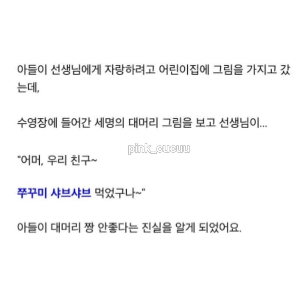 [배꼽의행방]진실을 알게된 아들..jpg 작성자얌먐먐뮴|작성시간25.11.17|조회수90,195 목록 댓글 26 글자크기 작게가 글자크기 크게가 출처: 인스타그램 @pink_cucuu 다음검색 현재 게시글 추가 기능 열기 북마크 공유하기 신고 센터로 신고 댓글 댓글 26 댓글쓰기 답글쓰기 댓글 리스트 작성자별이있는그대 | 작성시간 25.11.17 이건 달려가다 봐도 쭈구미맞다구요.... ㅋㅋㅋㅋㅋ 작성자포카리해 | 작성시간 25.11.17 ㅋㅋㅋㅋㅋㅋㅋㅋㅋㅋㅋㅋㅋㅋㅋ아 쭈꾸미 같긴해... 작성자수세미좋아 | 작성시간 25.11.17 시밬ㅋㅋㅋㅋㅋㅋㅋㅋㅋㅋㅋㅋㅋ 작성자쉿 몽환의 숲 | 작성시간 25.11.17 ㅋㅋㅋㅋㅋ쭈꾸샤브샤브 작성자저당흰앙금 | 작성시간 25.11.28 아 시바 ㅋㅋㅋㅋㅋ쭈꾸밐ㅋㅋㅋㅋㅋ 댓글 전체보기