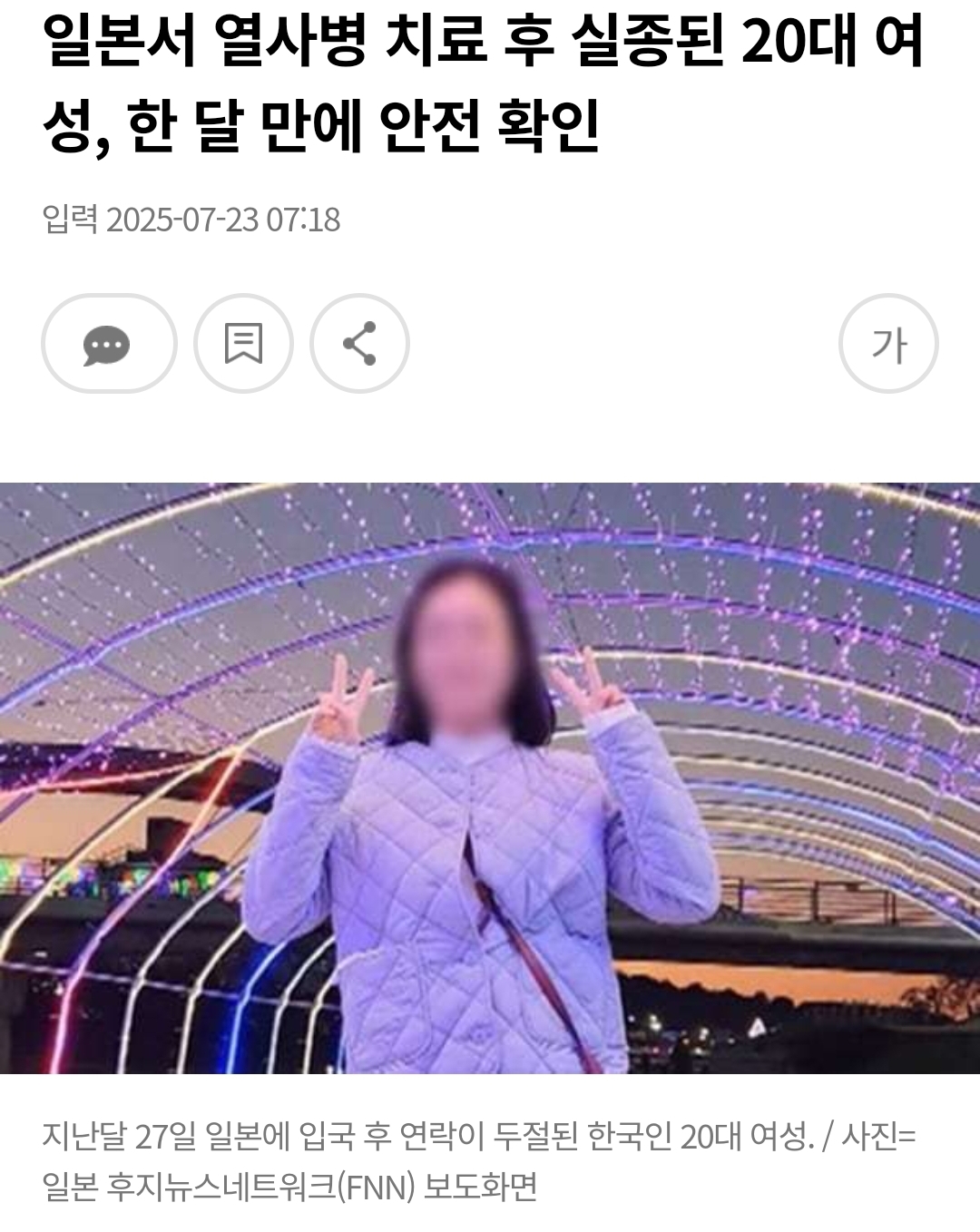일본 여행 중 열사병으로 병원 치료를 받은 뒤 한 달 가까이 연락이 끊긴 한국인 20대 여성의 안전이 확인됐습니다.