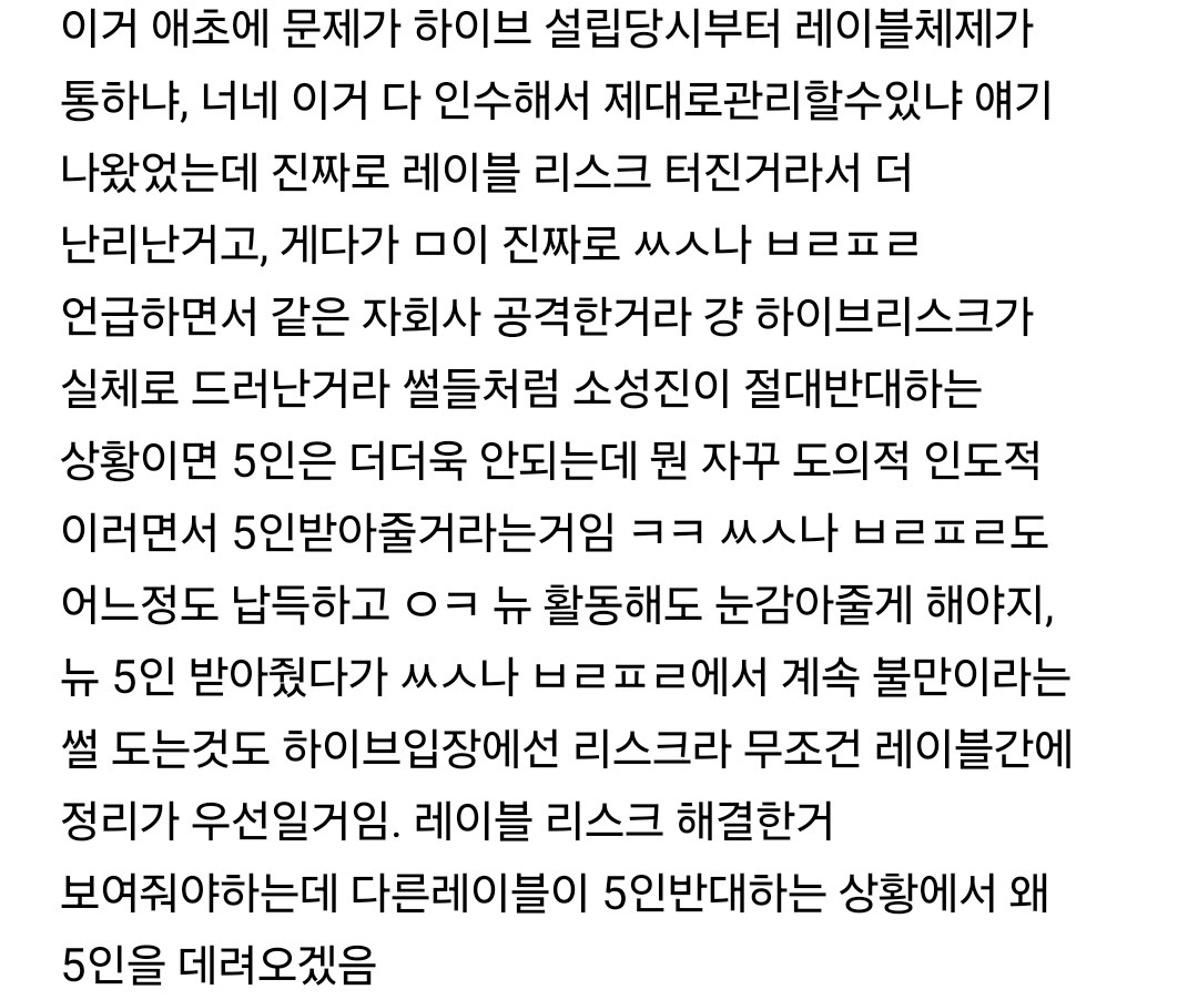 이런 식이면 잃는게 없으니까 너도나도 들튀시도해보려고 할거임 하이브는 소속 돌들이 많아서 그들한테도 이런 선례를 남기면 안됨