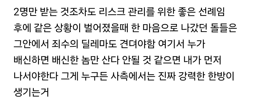 누구 한 명이 배신하고 회사로 돌아가면 배신한 사람만 살 수 있다는 인식을 만들어줌 하이브한텐 추가 안전장치가 생기는거임