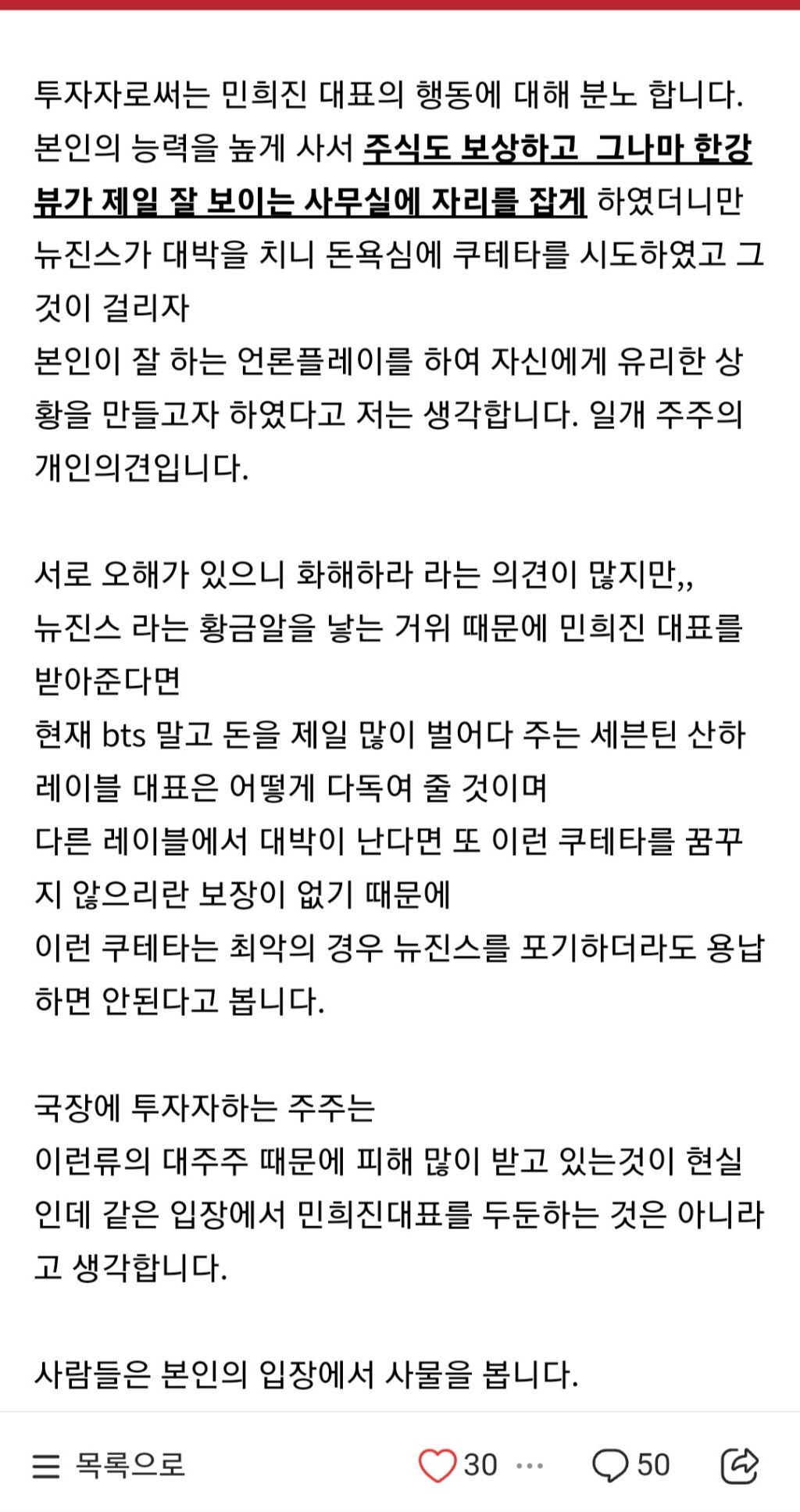 주주들이 제일 신경쓰는건 2번임 뉴진스는 중요하지 않음 근데 뉴진스 사례를 따라서 방탄, 엔하이픈 등 엄청난 캐시카우들이 따라서 소송해버리면?