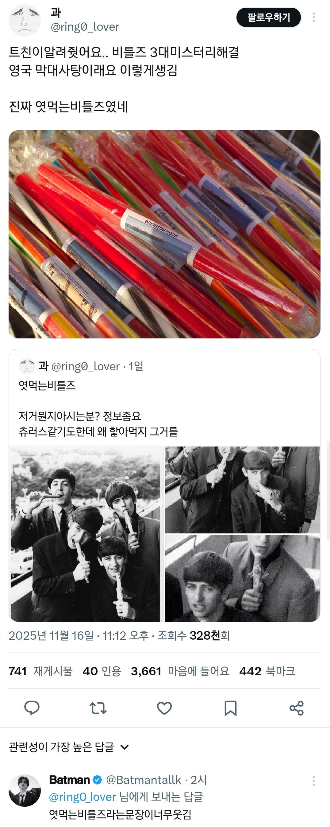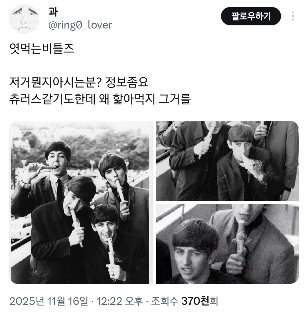 작성자Moleskine 작성시간 25.11.18 비틀즈가 빠큐날리는 사진일줄 알았엌ㅋㅋㅋㅋ