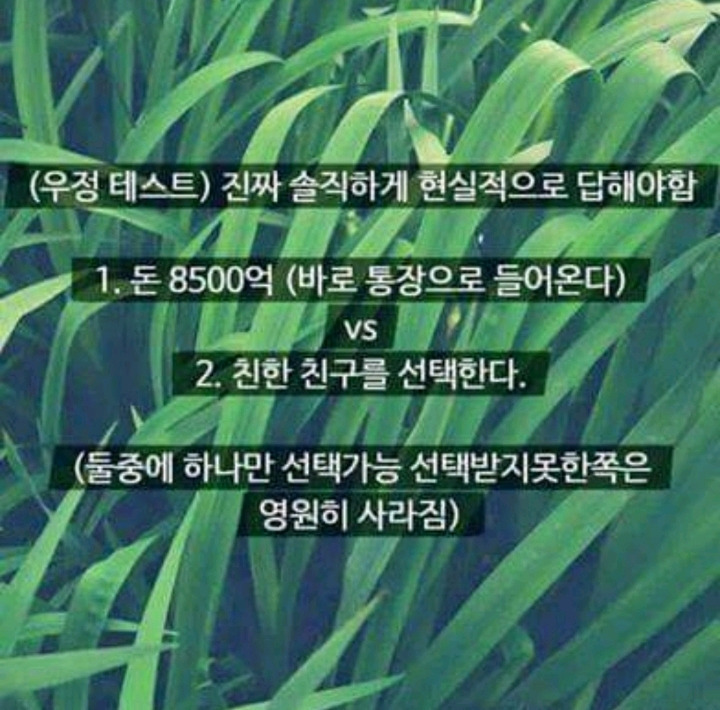 [스크랩] [흥미돋]돈 8500억vs단짝친구 작성자flflf|작성시간25.11.18|조회수61,942 목록 댓글 426 글자크기 작게가 글자크기 크게가 다음검색 스크랩 원문 : 쭉빵카페 현재 게시글 추가 기능 열기 북마크 공유하기 신고 센터로 신고 댓글 댓글 426 댓글쓰기 답글쓰기 댓글 리스트 작성자개재벌 | 작성시간 25.11.19 미안하다 친구야 작성자감자쫀드기 | 작성시간 25.11.19 내 친구도 그걸 원해 작성자될대로되겠지만열심히살기 | 작성시간 25.11.19 1 작성자러브윈즈올 | 작성시간 25.11.22 1 작성자진시황감자베리 | 작성시간 25.11.30 2 댓글 전체보기