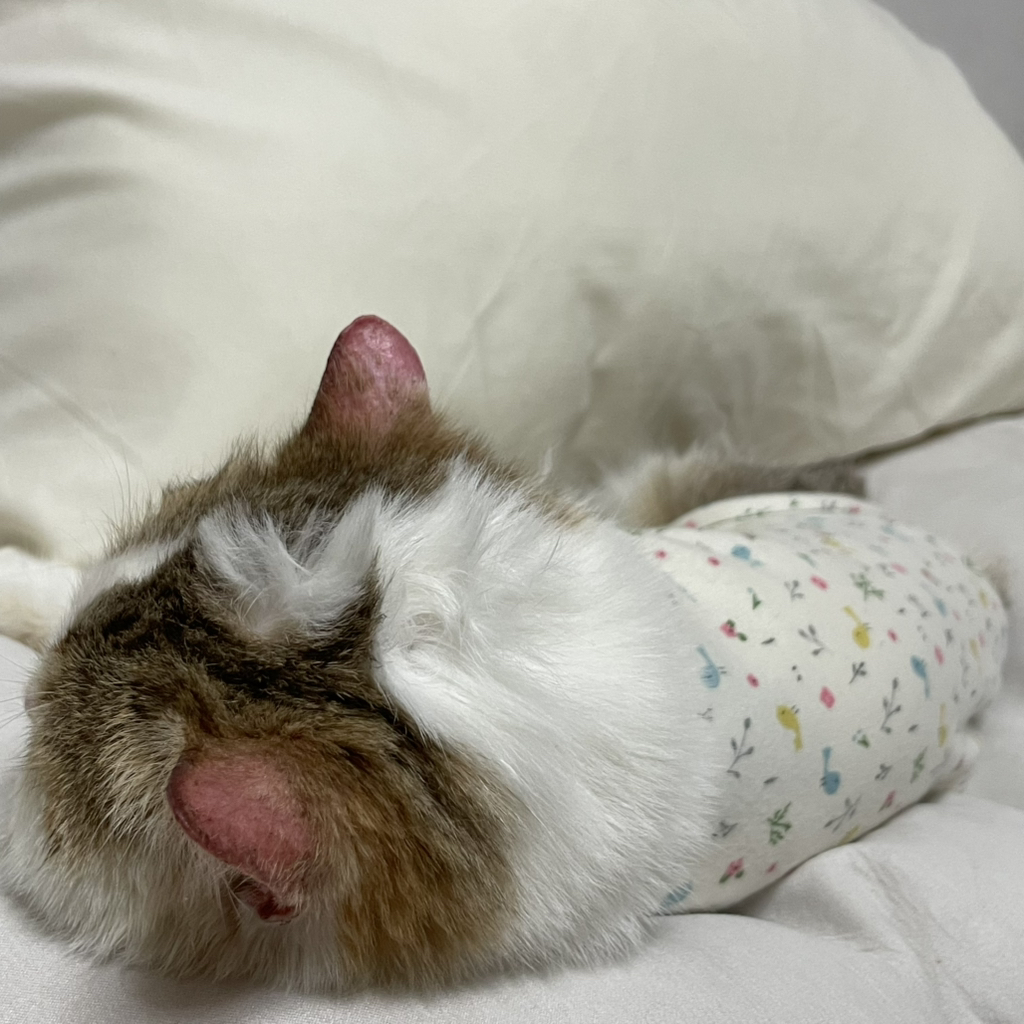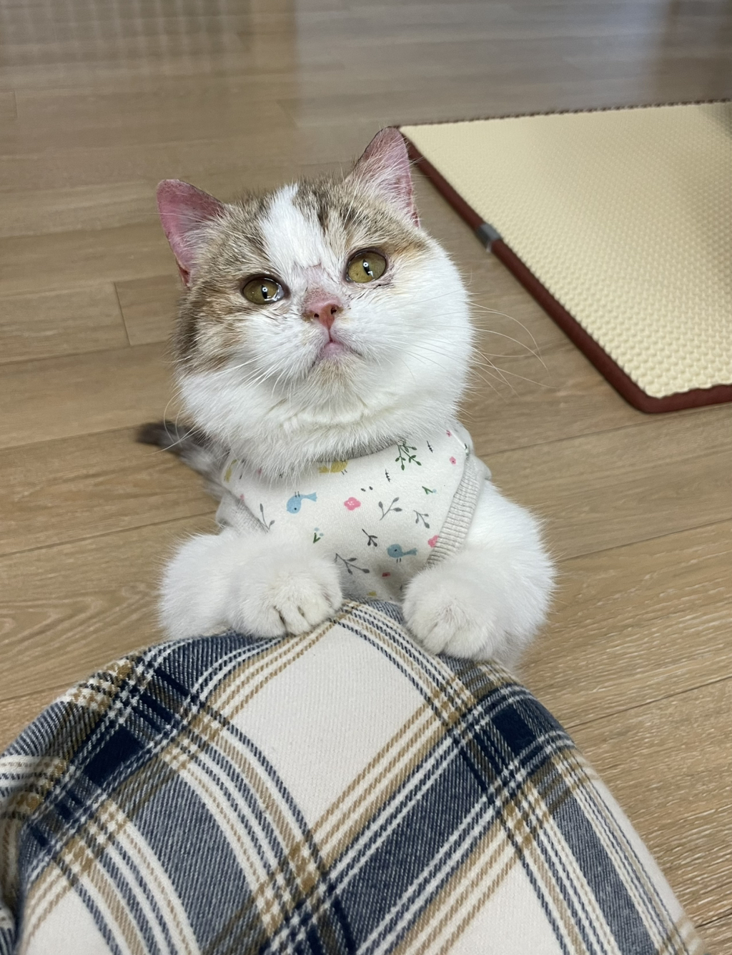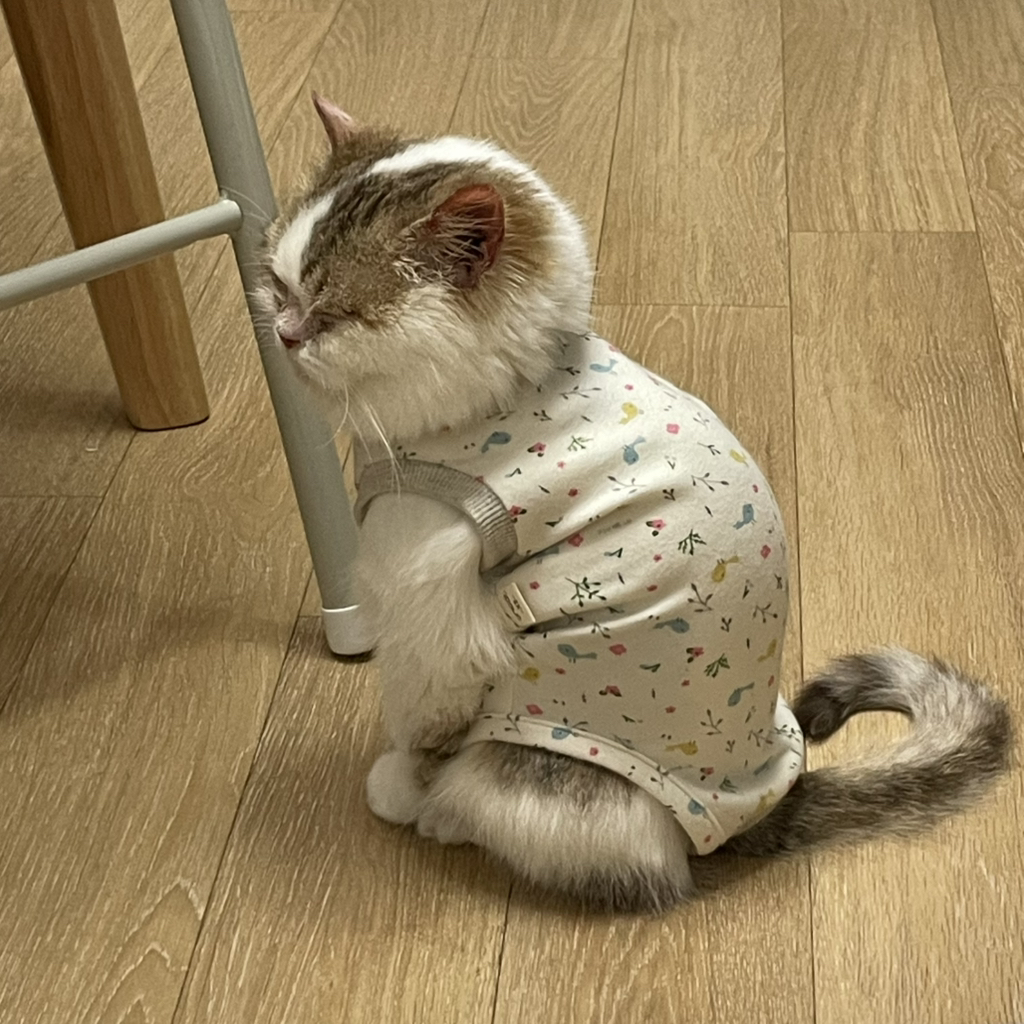 처음 집에 온 날 놀아달라고 바로 달라붙음(중성화를 바로 해서 환묘복 입은 상태)