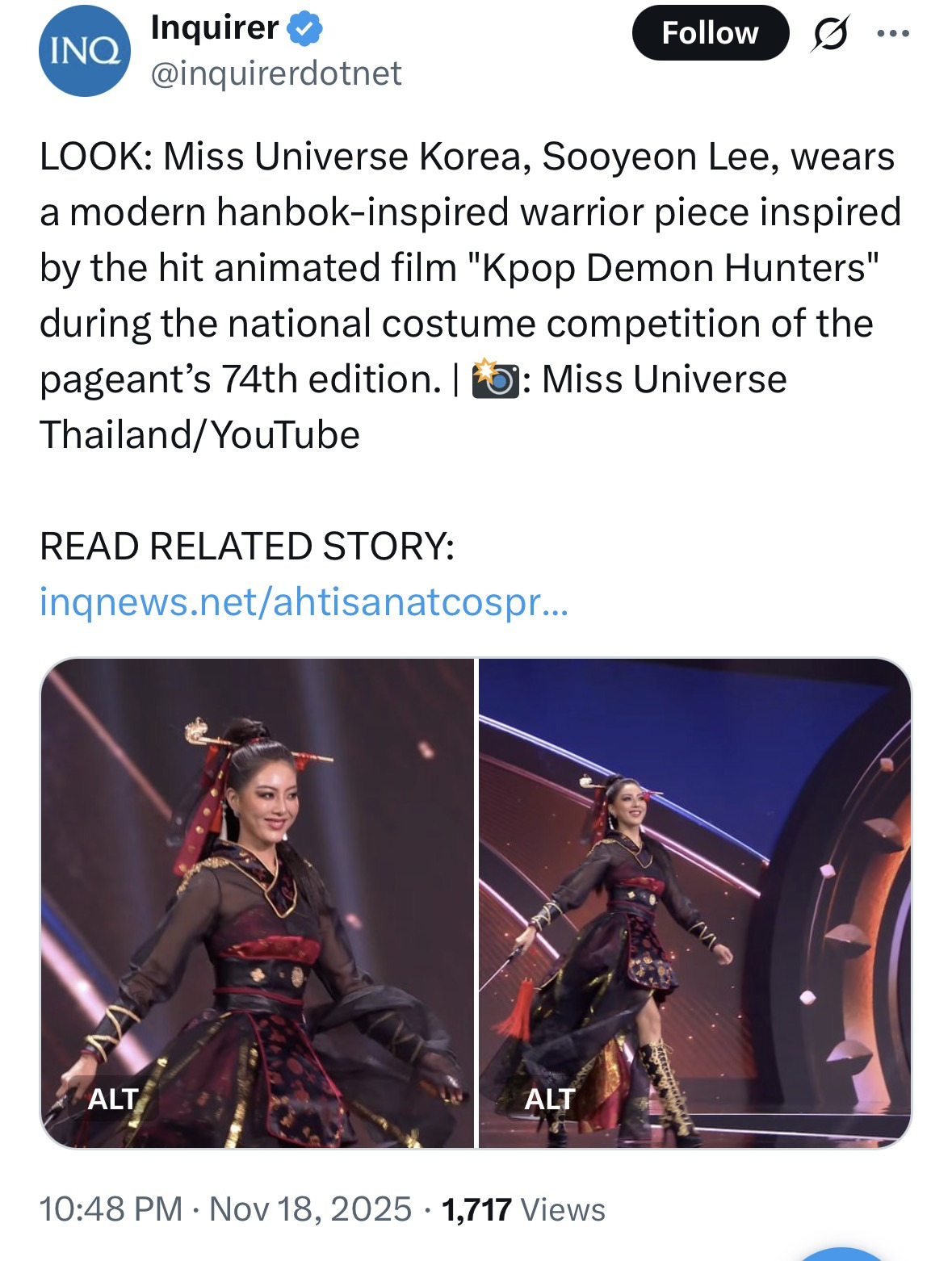 [흥미돋]케데헌에서 영감 받은 모던한복 입은 미스 유니버스 한국 대표 작성자Sunmoonstar02|작성시간25.11.19|조회수57,662 목록 댓글 39 글자크기 작게가 글자크기 크게가 출처: https://x.com/inquirerdotnet/status/1991035872326582487?s=20 다음검색 현재 게시글 추가 기능 열기 북마크 공유하기 신고 센터로 신고 댓글 댓글 39 댓글쓰기 답글쓰기 댓글 리스트 작성자완빈 | 작성시간 25.11.19 이런걸 아직도 하나... 작성자엔젤헌터스 | 작성시간 25.11.19 국뽕 작성자플리스 | 작성시간 25.11.19 멋지다 작성자TheSims3 | 작성시간 25.11.19 와 진짜 헌트릭스 같다 ㅋㅋㅋㅋ 작성자Valancy Stirling | 작성시간 25.11.20 내가 좋아하는 스탈 댓글 전체보기