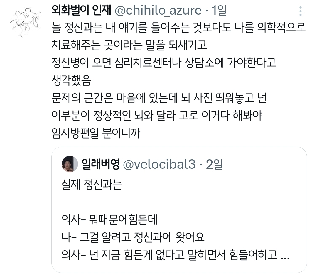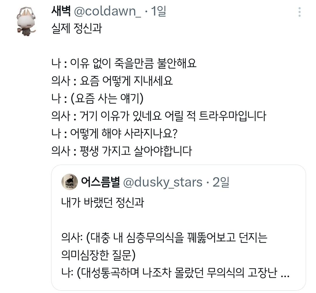 작성자멍멍멍머멍 작성시간 25.11.20 정신과 의사(오은영 박사)가 나오는 금쪽이 결혼지옥같은 프로그램 영향도 있는듯 정신과 가면 그렇게 해주는줄 개인의 아픈과거를 상담해주고 그 과정에서 진단해주고