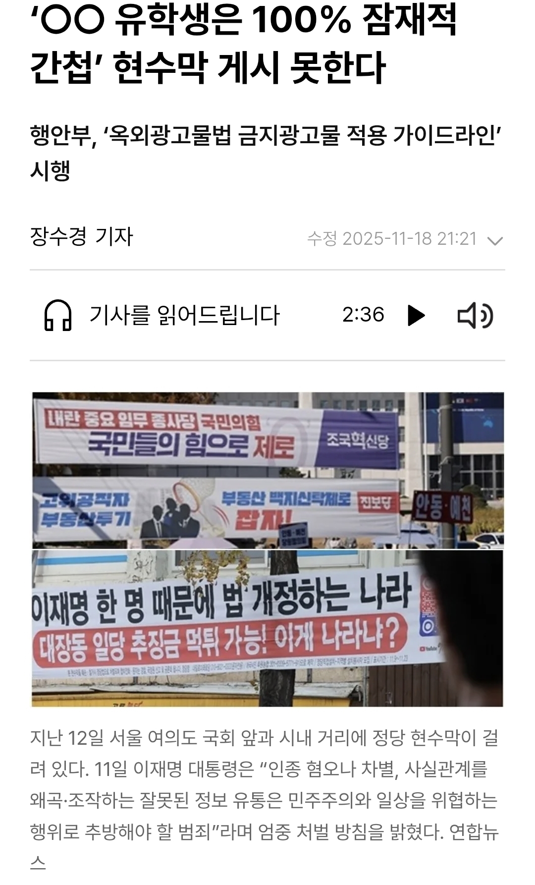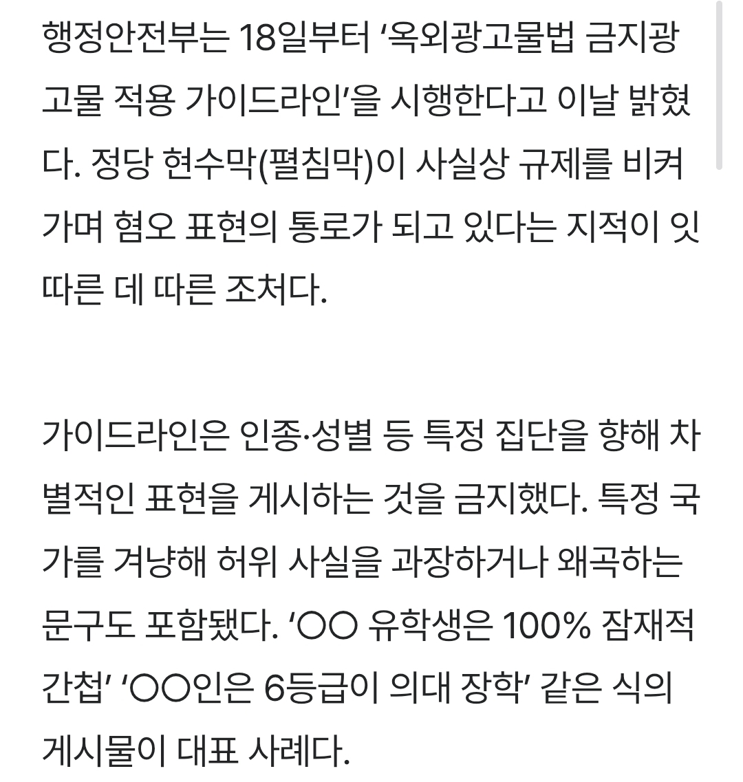 [여시뉴스데스크]‘○○ 유학생은 100% 잠재적 간첩’ 현수막 게시 못한다 작성자COPY BARA|작성시간25.11.19|조회수2,675 목록 댓글 4 글자크기 작게가 글자크기 크게가 출처: https://www.hani.co.kr/arti/area/area_general/1229981.html‘○○ 유학생은 100% 잠재적 간첩’ 현수막 게시 못한다앞으로 범죄행위를 정당화하거나, 인종·성차별 같은 인권침해 우려가 있는 옥외 광고물은 게시할 수 없게 된다. 행정안전부는 18일부터 ‘옥외광고물법 금지광고물 적용 가이드라인’을 시행www.hani.co.kr 다음검색 현재 게시글 추가 기능 열기 북마크 공유하기 신고 센터로 신고 댓글 댓글 4 댓글쓰기 답글쓰기 댓글 리스트 작성자왜때문이죠? | 작성시간 25.11.19 그럼 될거라 생각했나 작성자우야쓰 | 작성시간 25.11.19 진짜 개심해 극우새끼들 작성자끼리라 | 작성시간 25.11.19 초등학교옆에 중국산 급식 어쩌고저쩌고 하는거 너뮤극혐이야 아 작성자일빠는 눈치챙겨 | 작성시간 25.11.19 환경오염 오져 ㅅㅂ 댓글 전체보기