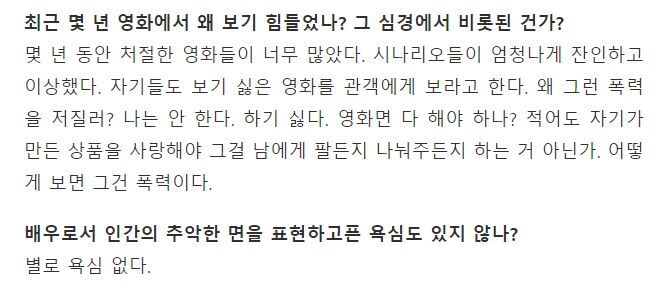 작성자Range 작성시간 25.11.21 나도 잔인하고 폭력적인거 싫어해서 정말 공감간다 ㅠ 근데 넷플 인기작만 봐도 잔인하고 자극적인게 잘 팔려서 배우로썬 마다하지 못할거 같은데 신념있네 멋있다