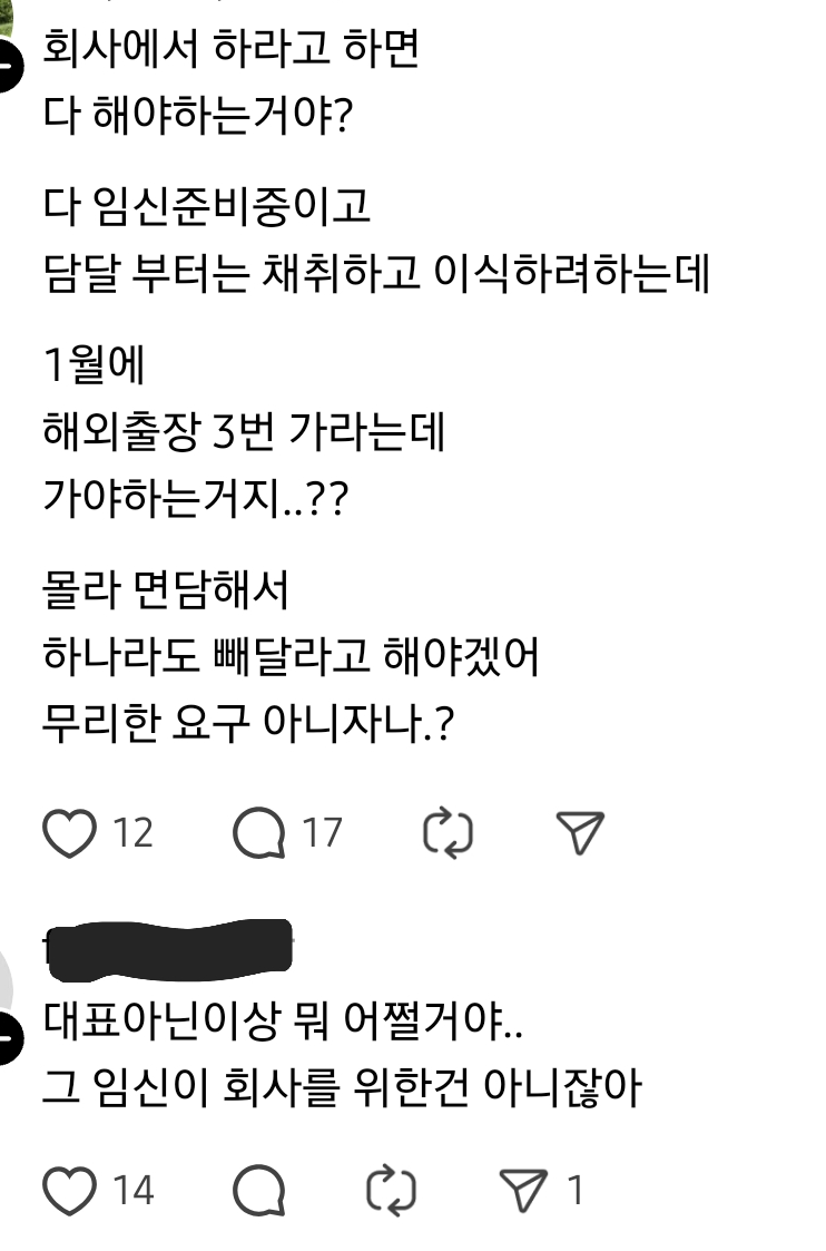 [흥미돋]나 임신준비중인데 회사에서 출장 가라면 가야돼?? 작성자머리부터발끝까지한있슈|작성시간25.11.19|조회수16,411 목록 댓글 74 글자크기 작게가 글자크기 크게가 출처: https://www.dmitory.com/389232958 다음검색 현재 게시글 추가 기능 열기 북마크 공유하기 신고 센터로 신고 댓글 댓글 74 댓글쓰기 답글쓰기 댓글 리스트 작성자클삼온다 | 작성시간 25.11.20 뭔씹;; 작성자백째롱 | 작성시간 25.11.20 임신 했다도 아니고 준비 중? 작성자마리를사또밥 | 작성시간 25.11.20 준비하는 김에 취업도 같이 준비하면 되겠다 작성자지구야아프지마 | 작성시간 25.11.20 풉.. 작성자ㅈㅅㅋㄹㄴ | 작성시간 25.11.20 하 댓글 전체보기