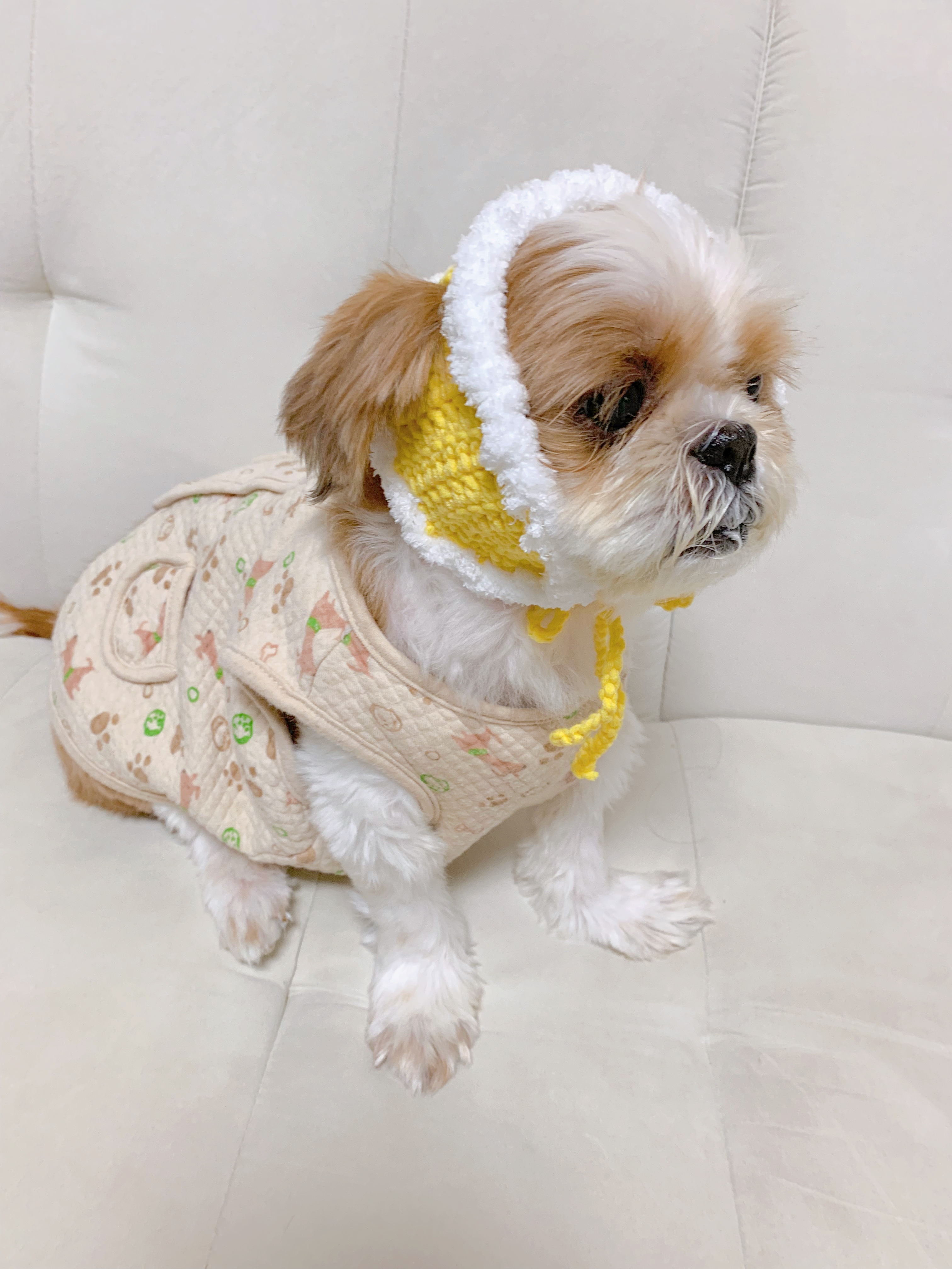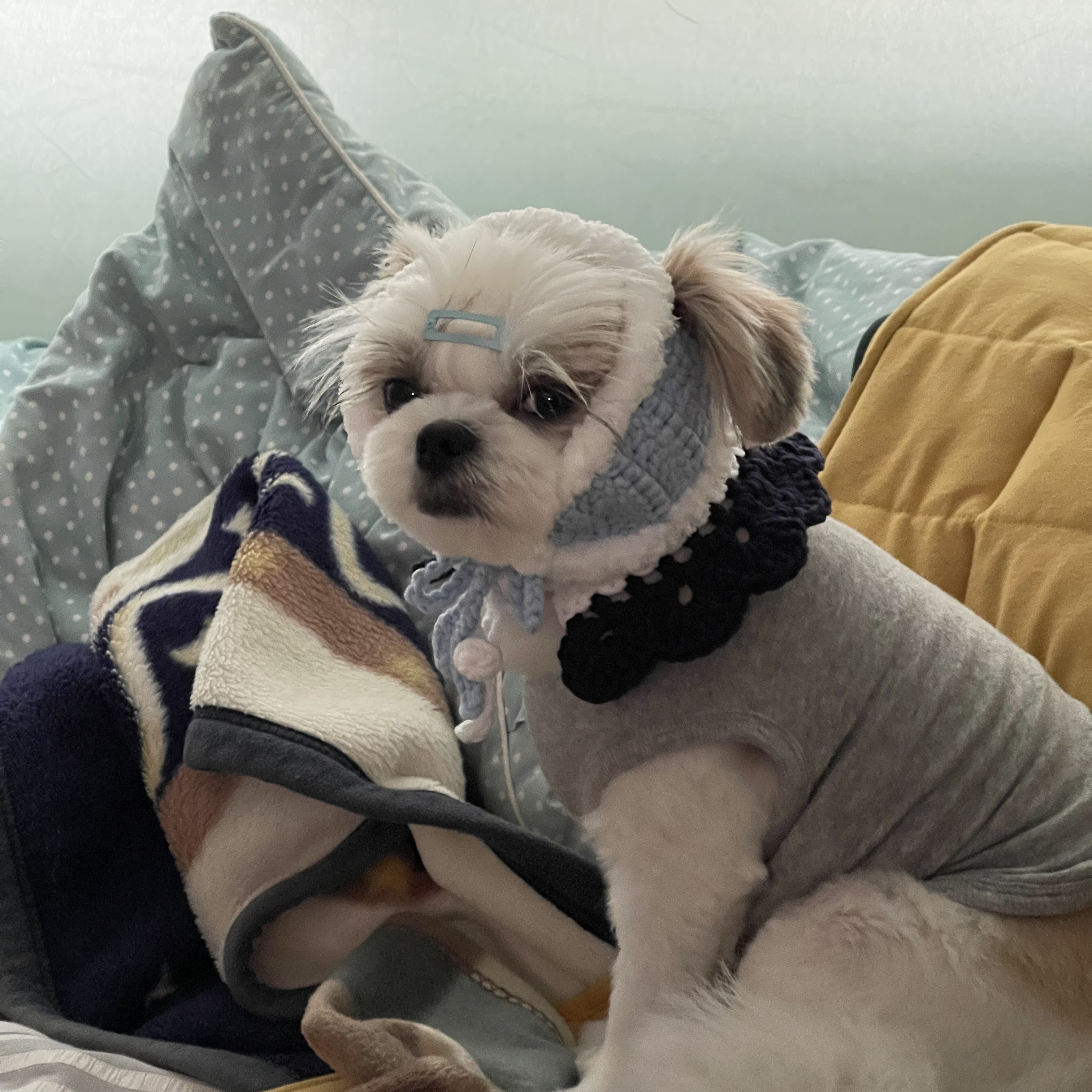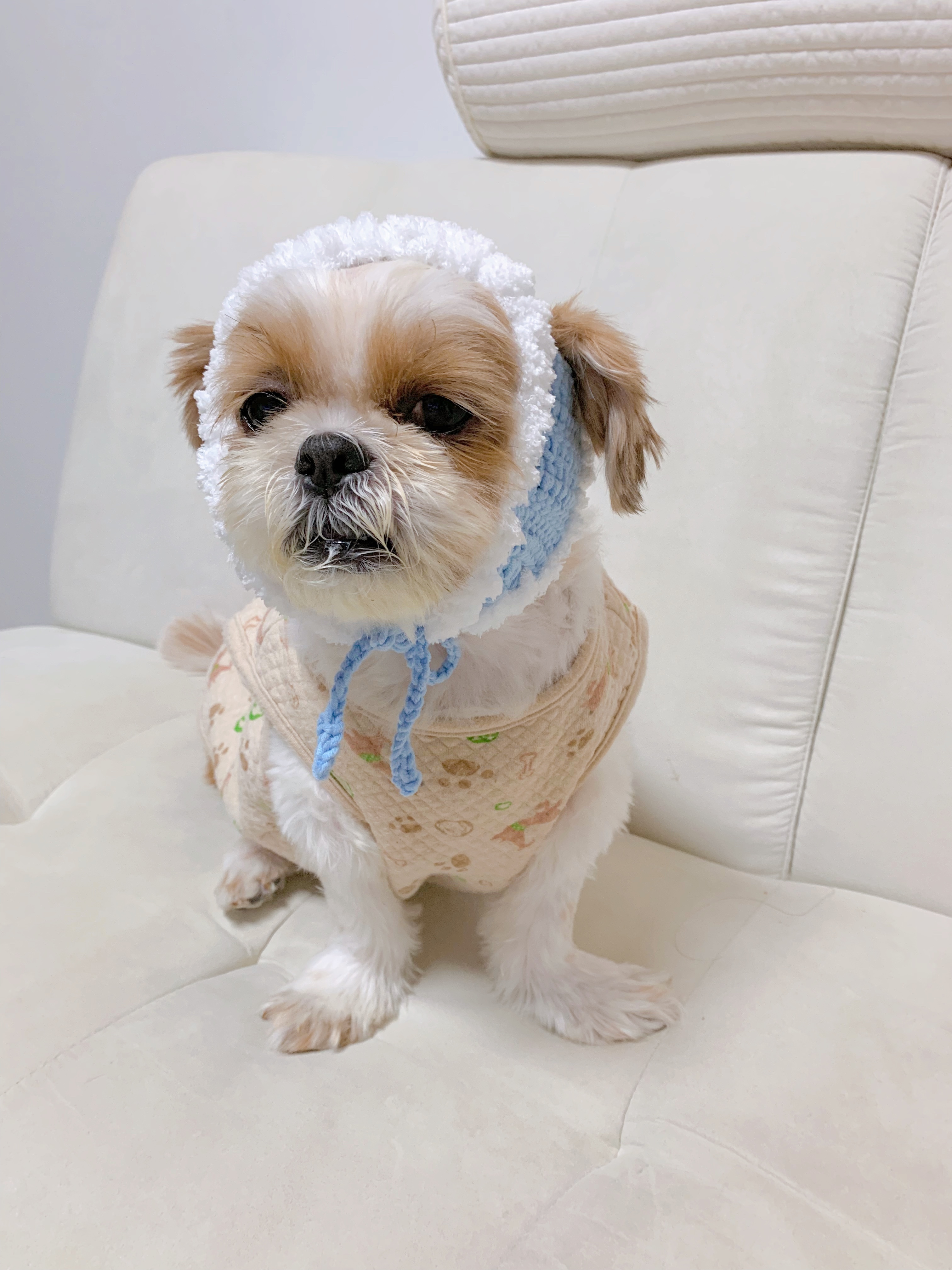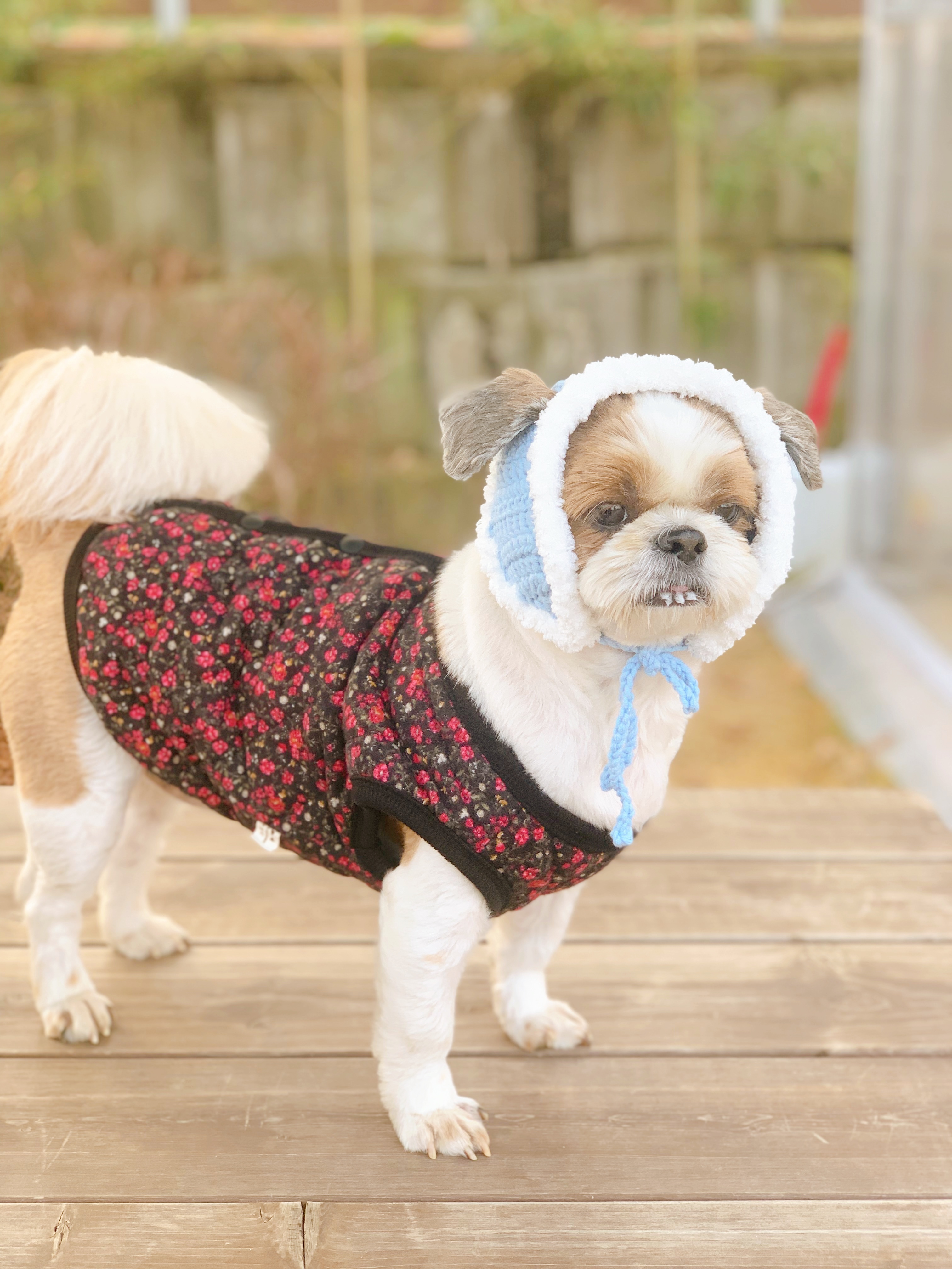넘 귀엽지만 울 강쥐가 많이 커부려서 옷도 낑기고,,, 처음 만들어본 이 모자도 대가리에 낑겼다고 한다..