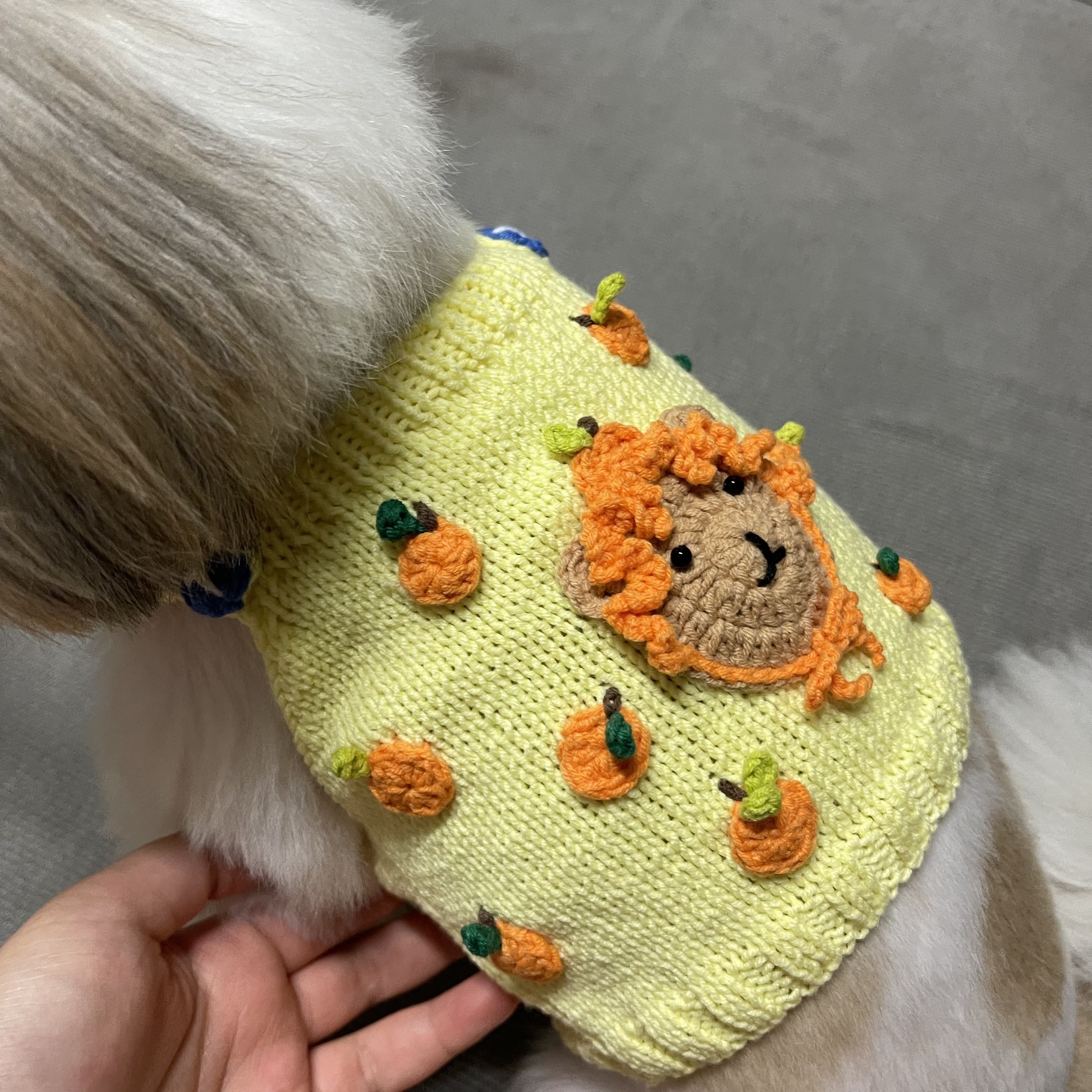 ㅎㅎ이건 제주도에 살고있는 칭구 두식이에게 보내주는 옷이얐어. 곰도리가 쓴 모자는 제주도 여행갈때 울집 강쥐에게 씌워줬던 모자를 모티브로 해서 ㅋㅋㅋㅋ만들어봤어. 귤이 컨셉이야 ㅎㅎ '감귤밭의두식'