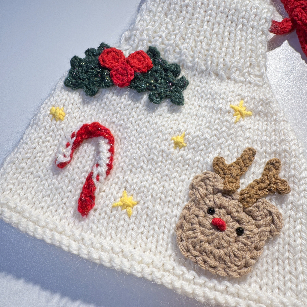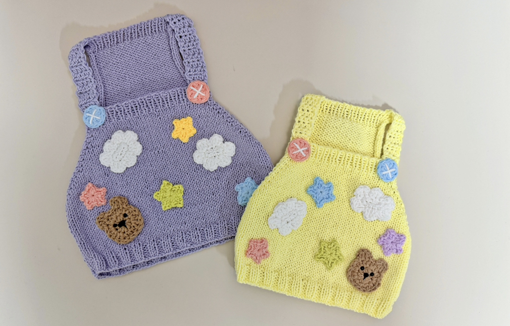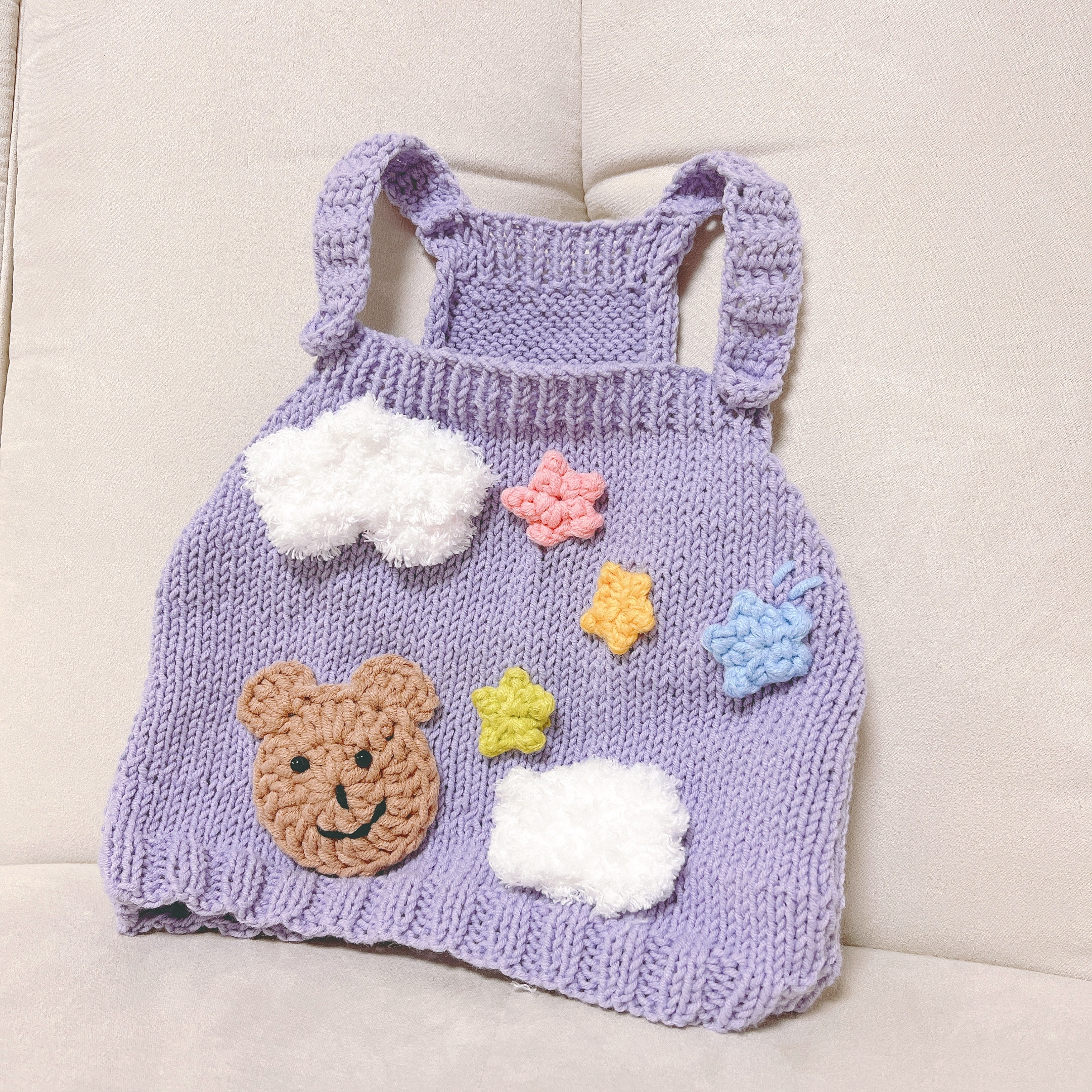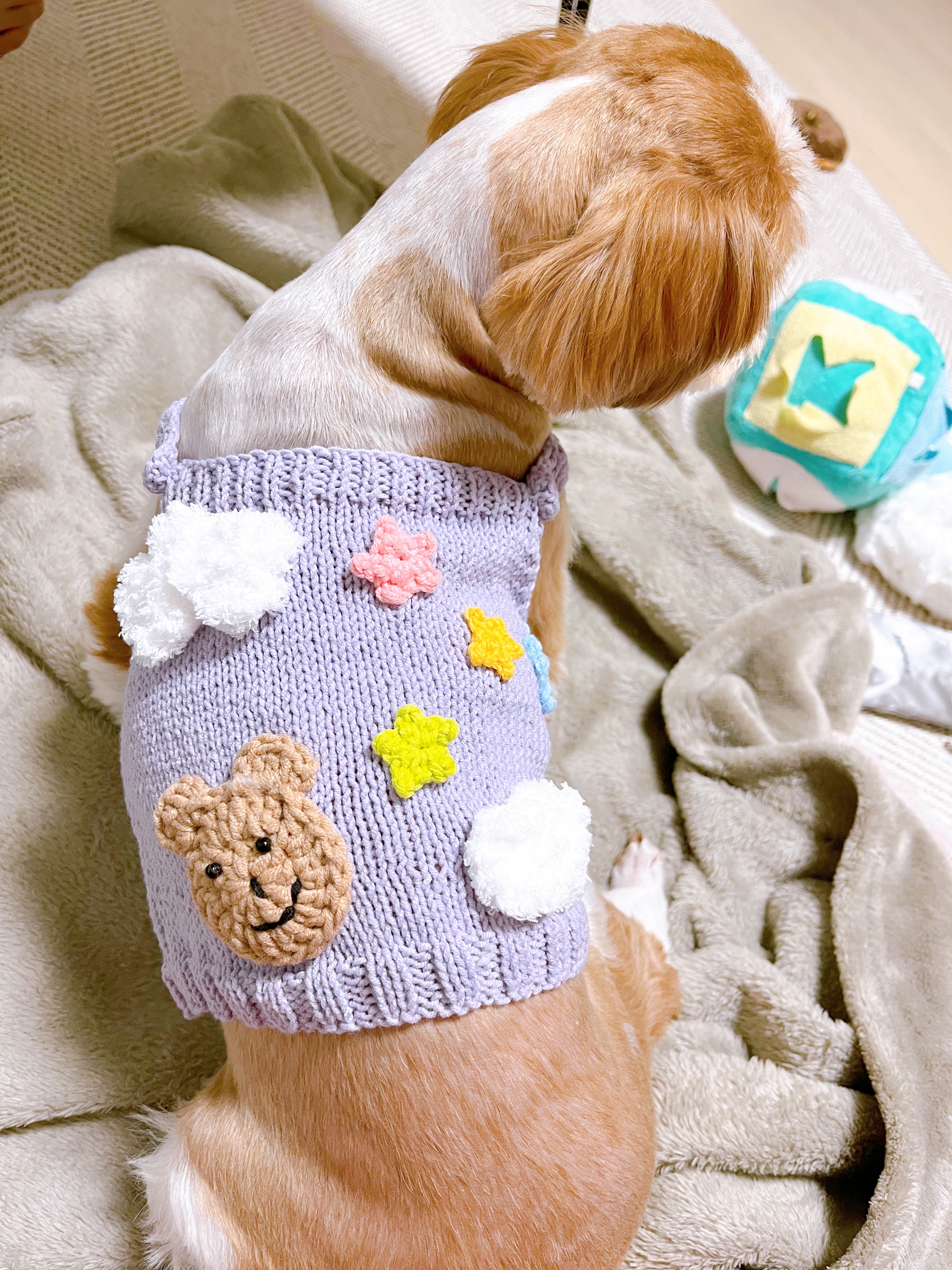 이건.. 동생이 얼마 뒤에 이사하는데 집들이 선물이랑 뭐 이것저것 떠달라 그래서 뜨다가, 옛날에 내가 떠준 조끼에 자기도 내가 만드는 강아지 옷처럼 뭘 잔뜩 붙이고싶다그래서(요구사항이 항상 많은 고객..)