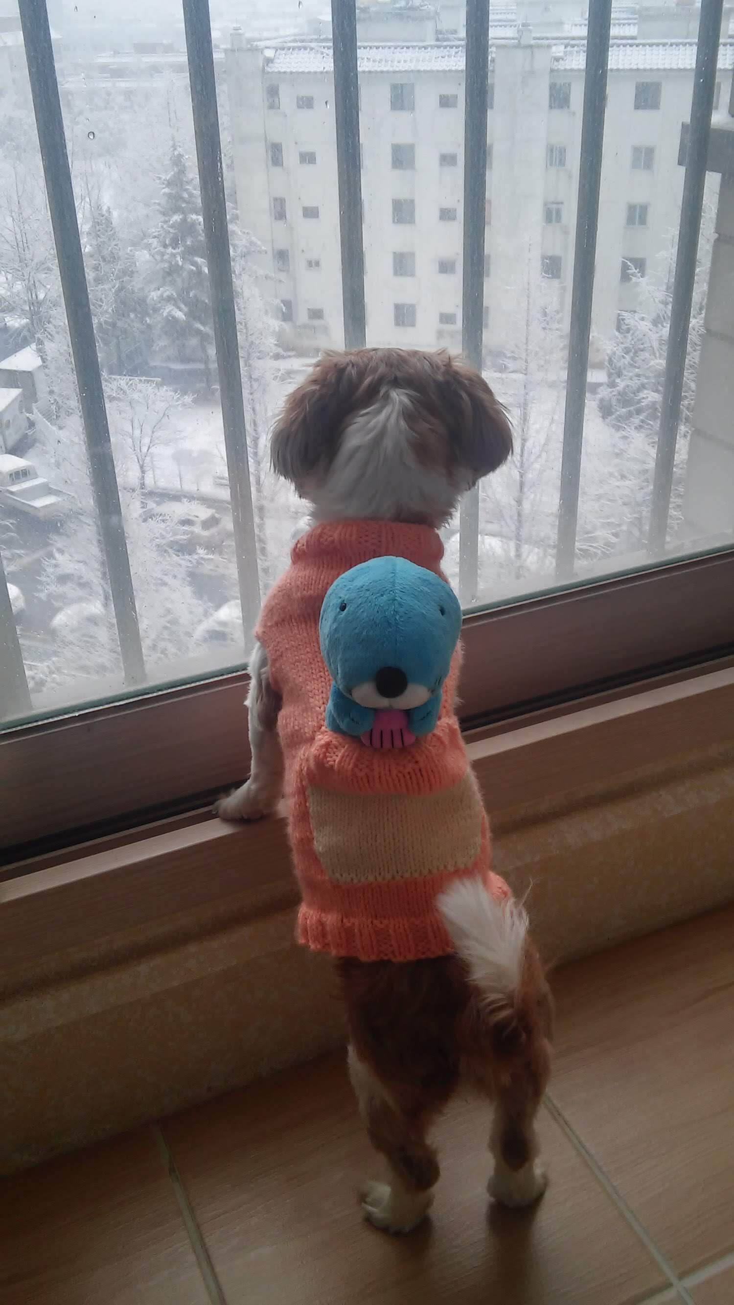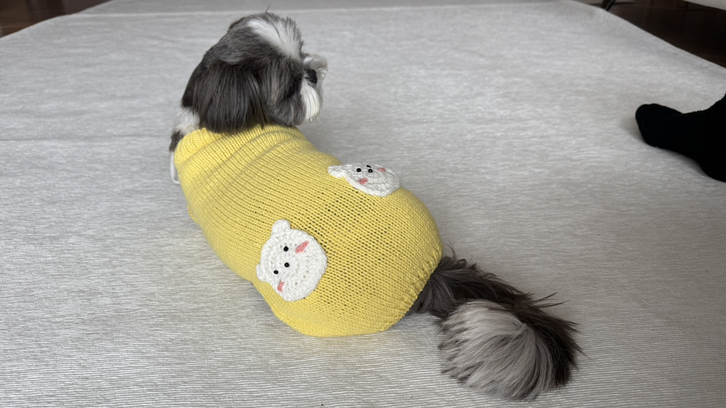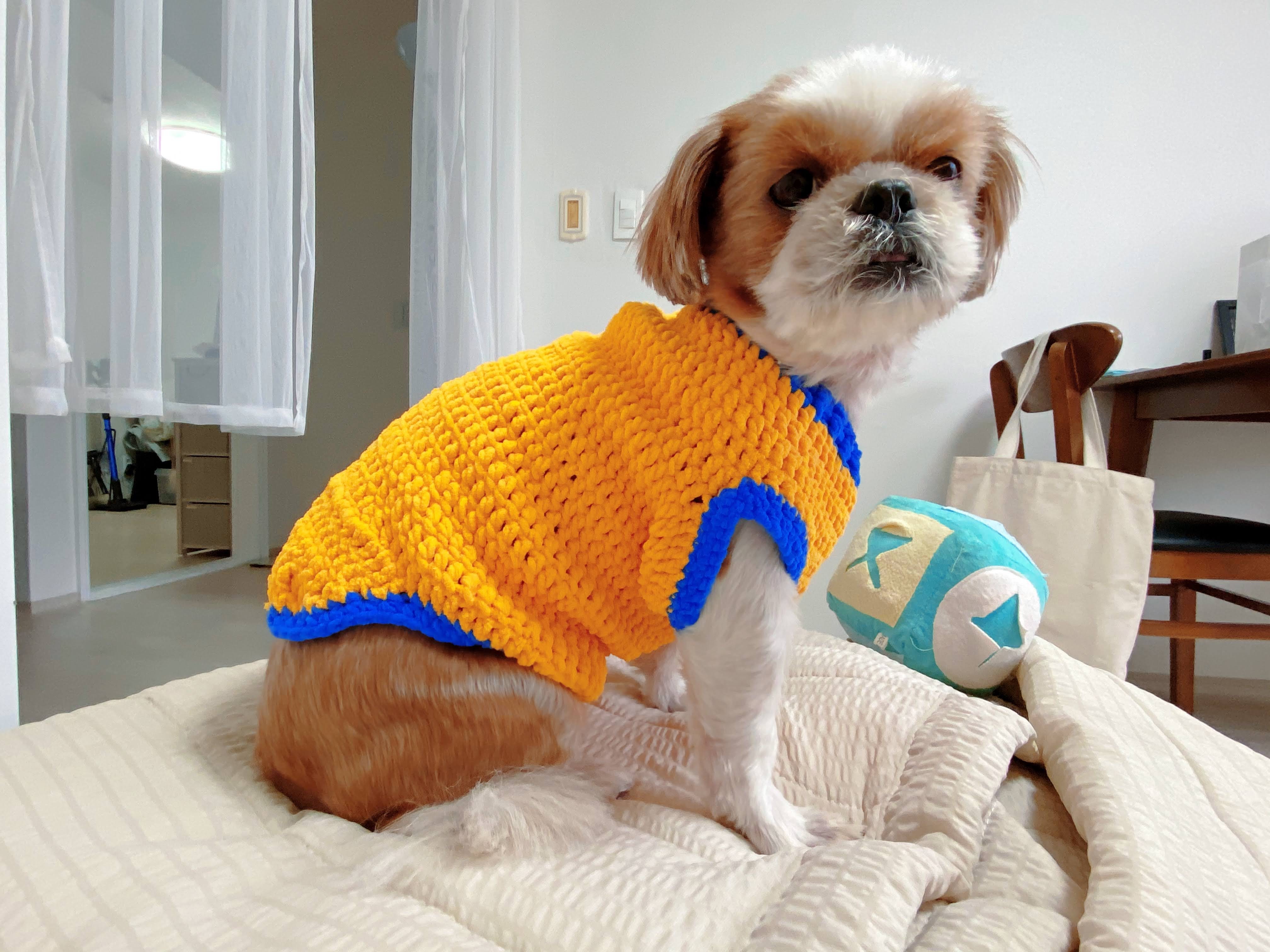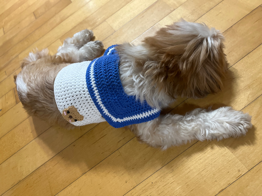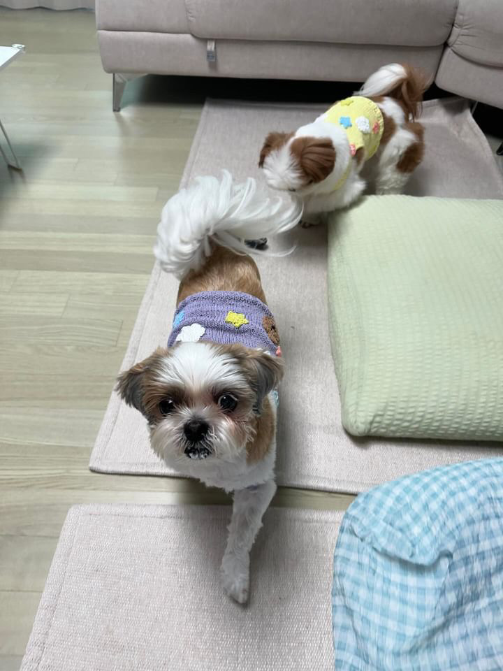 임보처에서 울 강쥐를 데려왔을 당시가 11월이라 추웠을때..처음으로 떠준 옷인데 ㅋㅋㅋㅋㅋ이건 아주 엉망진창이였어 중간중간 빵꾸도 나고 말이지,..