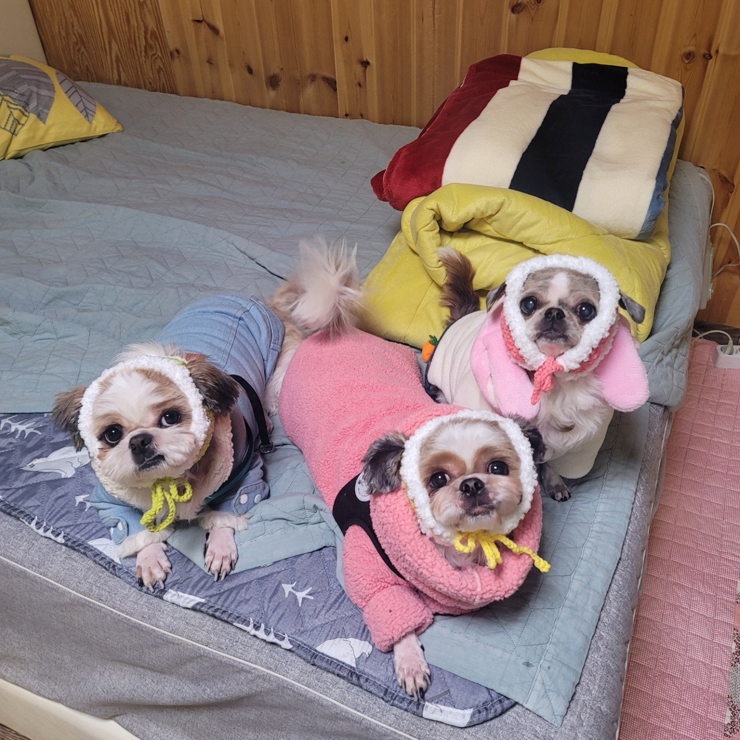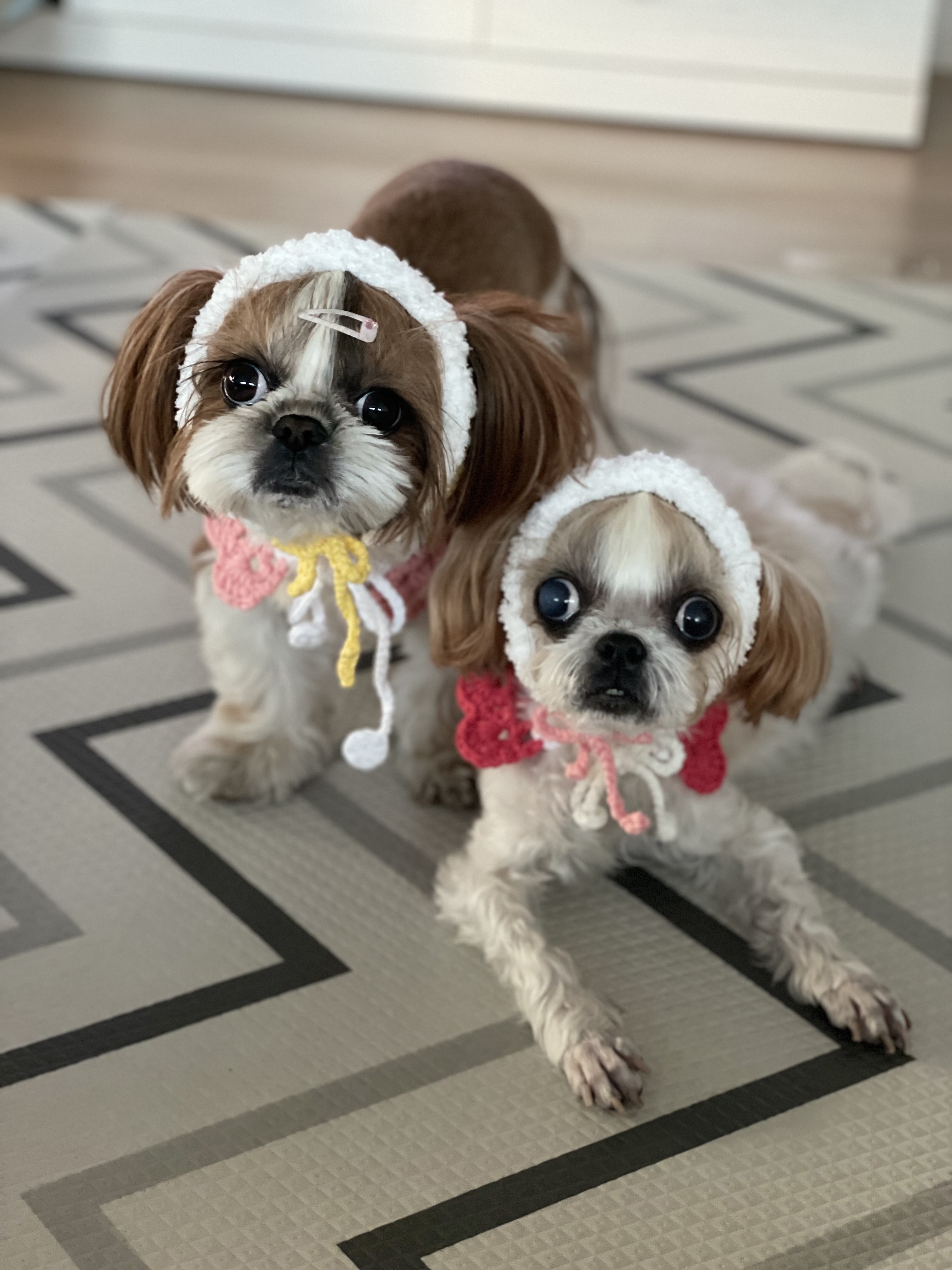 이땐 겨울에 귀도리를 많이 만들어서 강쥐친구들에게 나눠주겠다는 마음을 먹고 귀도리 프로젝트를 했어 ㅋㅋㅋ그래서 만들었던 색상별 테스트사진이야 ㅎㅎ