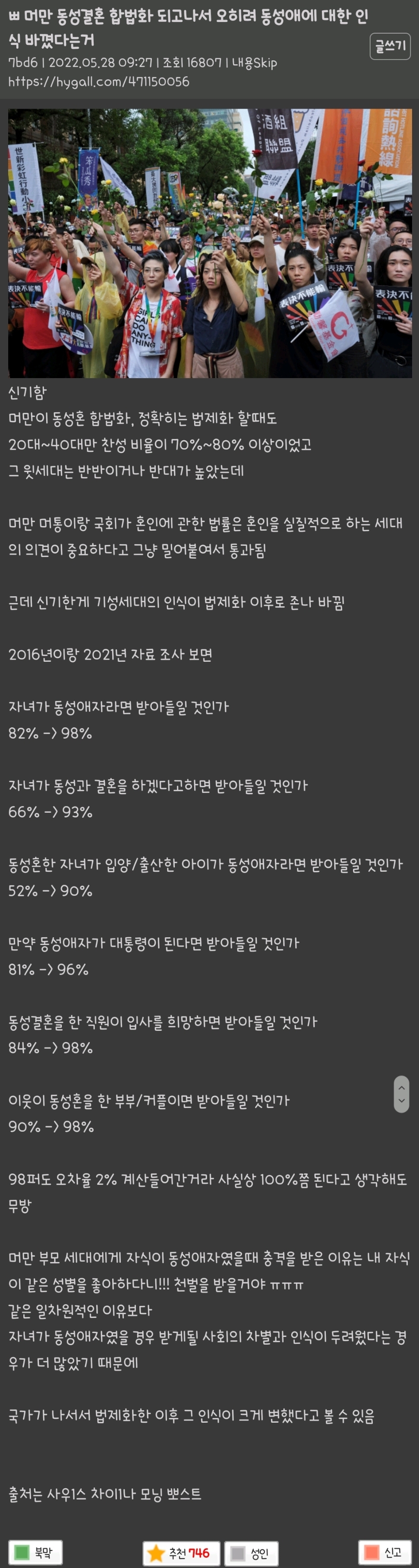 [스크랩] [흥미돋]대만 동성결혼 합법화 되고나서 오히려 동성애에 대한 인식 바꼈다는거 작성자women love women|작성시간25.11.20|조회수20,956 목록 댓글 28 글자크기 작게가 글자크기 크게가 출처 : https://hygall.com/471150056해연갤 - ㅃ 머만 동성결혼 합법화 되고나서 오히려 동성애에 대한 인식 바꼈다는거해연갤, 해외연예갤러리, 영화, 드라마, 배우, 가수, 밴드, 모델, 연예인, 게임, 애니, 스포츠hygall.com 다음검색 스크랩 원문 : *여성시대* 차분한 20대들의 알흠다운 공간 현재 게시글 추가 기능 열기 북마크 공유하기 신고 센터로 신고 댓글 댓글 28 댓글쓰기 답글쓰기 댓글 리스트 작성자되면 굿 아니면 유감 | 작성시간 25.11.20 인식 바뀌길 기다리면 안됨 무조건 법제화 시키고 걍 강제로라도 인식이 바뀌게 만들어야지 작성자아브라카다브랄라 | 작성시간 25.11.20 우리도 합법화하자! 작성자밟꿈 | 작성시간 25.11.20 합법화x 법제화o 동성애는 불법 이성애는 합법이 아니랍니다 작성자건강한똥강아지이나비 | 작성시간 25.11.20 우리도 법제화하자. 작성자TADC | 작성시간 25.11.20 사람들이 법 테두리 안에 있는건 그런갑다 하는듯.. 댓글 전체보기