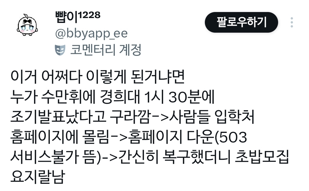 [기타]경희대학교 초밥모집 합격자 발표 작성자COPY BARA|작성시간25.11.20|조회수80,242 목록 댓글 59 글자크기 작게가 글자크기 크게가 출처: https://x.com/bbyapp_ee/status/1991007199427215816?t=q2Yx4szi0ETn9ukQ1asm5Q&s=19 다음검색 현재 게시글 추가 기능 열기 북마크 공유하기 신고 센터로 신고 댓글 댓글 59 댓글쓰기 답글쓰기 댓글 리스트 작성자머쨍이토마토 | 작성시간 25.11.20 수시 -> 초밥 싴ㅌㅌㅋㅋㅋ바ㅋㅋㅋㅋㅋㅋㅋㅋㅋㅋㅋㅋㅋㅋ 작성자2025대운 | 작성시간 25.11.20 ㅌㅌㅌㅌㅌㅌㅌㅌㅋㅋㅋㅋㅋㅋㅋㅋㅋㅋ 작성자윈스턴 | 작성시간 25.11.20 전 흰살생선 전형으로 합격시켜주세요 작성자그런쓰레기같은말좀안했으면좋겠어 | 작성시간 25.11.20 귀여워 ㅋㅋㅋㅋㅋㅋㅋㅋㅋ 작성자단발머리소녀 | 작성시간 25.11.24 ㅋㅋㅋㅋㅋㅋㅋㅋㅋㅋㅋㅋㅋㅋㅋㅋㅋㅋㅋㅋㅋㅋㅋ 댓글 전체보기