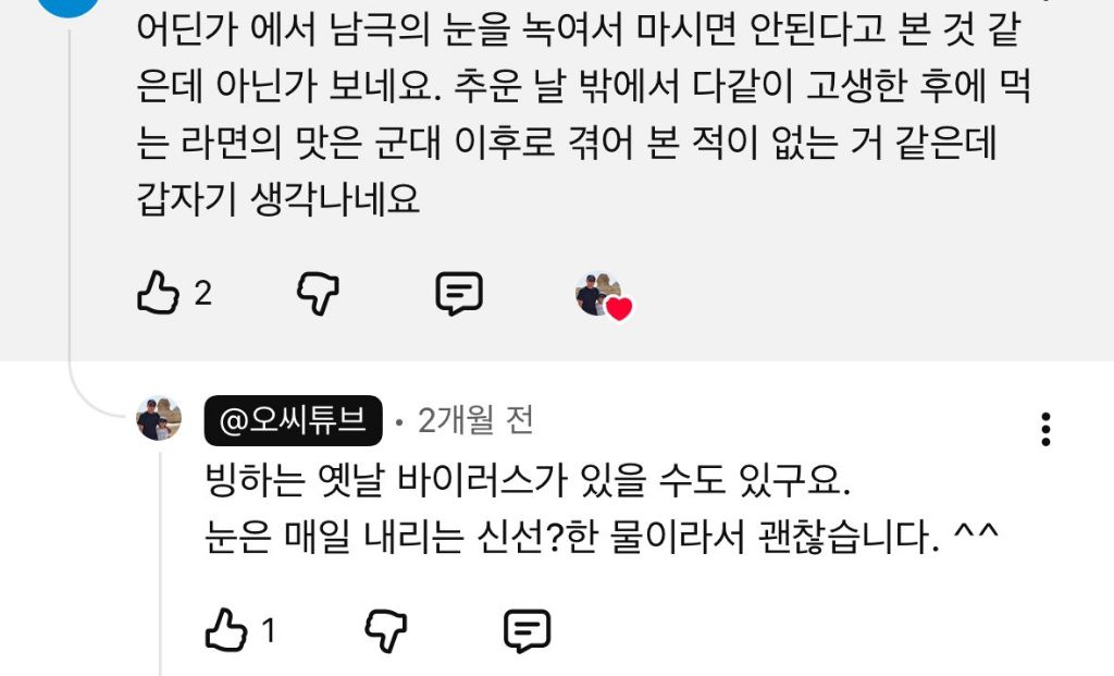 [스크랩] [흥미돋]남극 세종기지 대원들만의 별미 작성자치와|작성시간25.11.20|조회수39,868 목록 댓글 15 글자크기 작게가 글자크기 크게가 다음검색 스크랩 원문 : 한류열풍 사랑 현재 게시글 추가 기능 열기 북마크 공유하기 신고 센터로 신고 댓글 댓글 15 댓글쓰기 답글쓰기 댓글 리스트 작성자손가인 손민수 | 작성시간 25.11.20 오 뭔가 낭만이다 ㅋㅋㅋㅋ 작성자저녁없는삶 | 작성시간 25.11.20 한국에선 방금 내린 눈도 녹으면 약간 누리끼리한 색이던데 저긴 괜찮나?ㅋㅋㅋ맛있겠다.. 작성자하이하이 | 작성시간 25.11.20 펭귄이 안 밟았나 답댓글 작성자파랗게 새파랗게 | 작성시간 25.11.20 아 뭔가 ㄱㅇㅇ 작성자비:류연 | 작성시간 25.11.20 남극은 환경오염이 덜하기도 하고 끓여서 먹는거라 ㄱㅊ을듯 댓글 전체보기