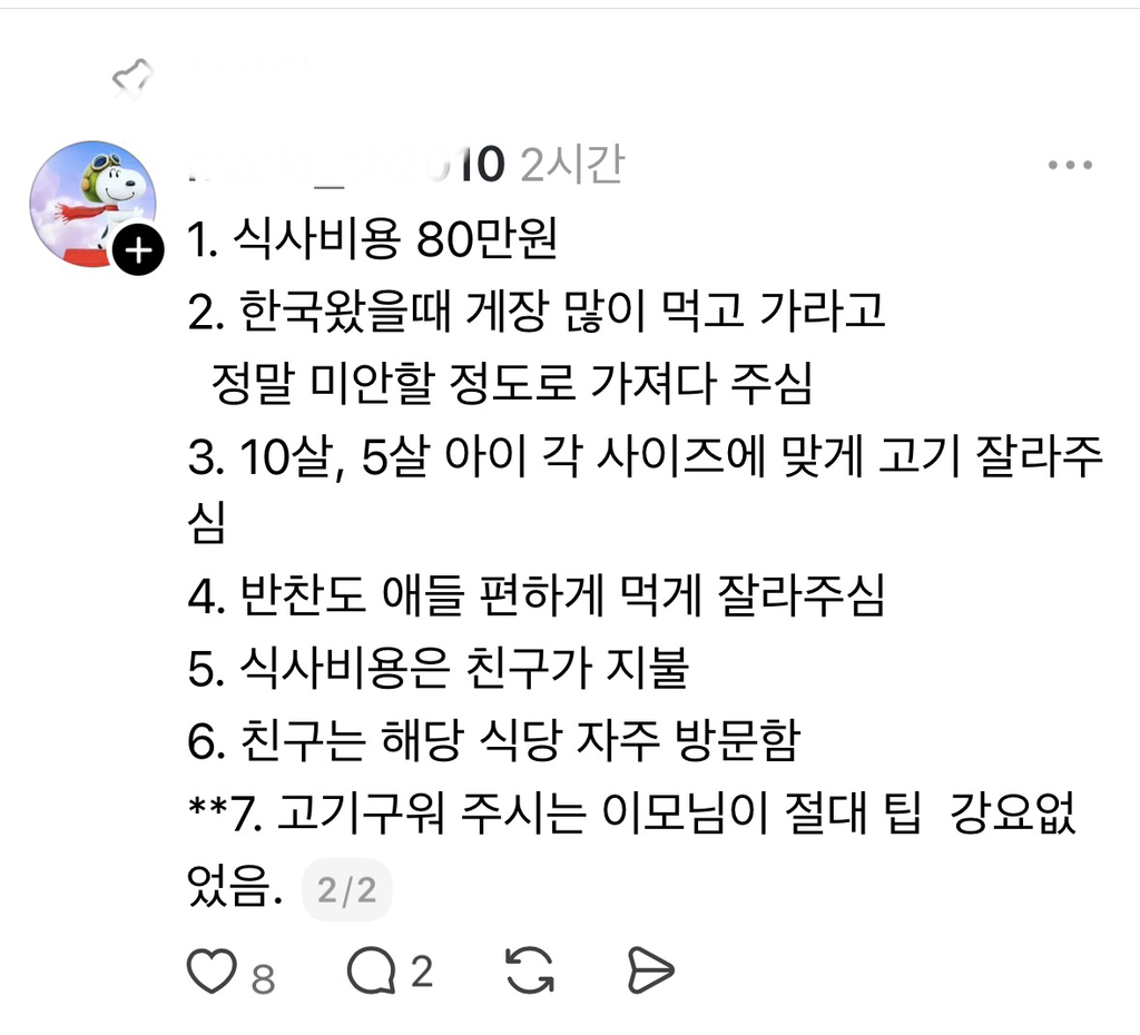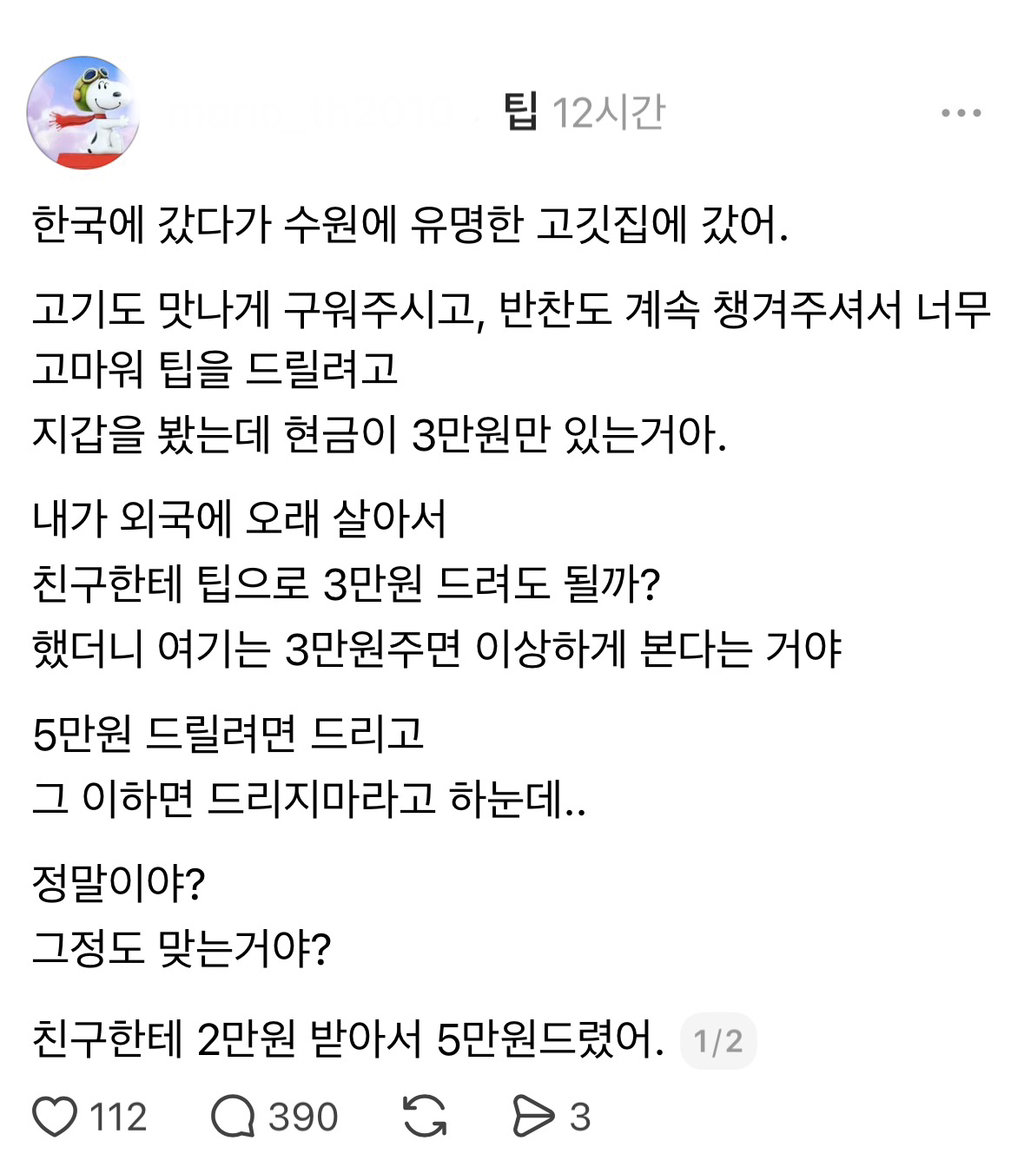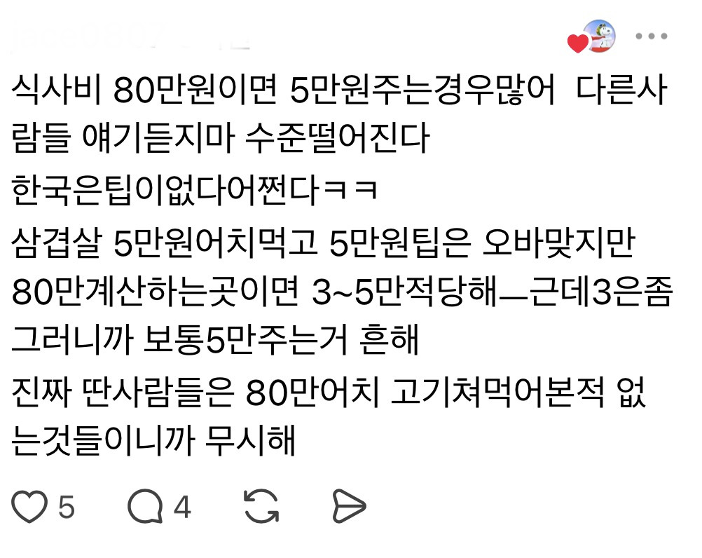 작성자메이데이메이데이메이데이 작성시간 25.11.26 뭘 5가기본... 안주는사람도개많은디... 주는게 나쁘다곤생각안하는데 아예테이블 맡아서 고기구워주고 챙겨주고하는 식당들이나 대게집 참치집이런데는 종종주긴함 나도 호텔일할때나 룸있는식당에서 알바할때는 한번씩받음.. 근데 100테이블보면 1,2명줌ㅋㅋㅋㅋ어차피 팁안받는 가정하에 월급받는거라 그게 그렇게 필수적인게아닌데
