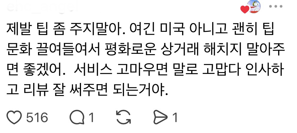 작성자침대프로텍터 작성시간 25.11.25 우리 엄마 고깃집에서 고기 구워 주는 일 하는데 원래 열심히 하지만 받으면 <<금액 상관없이>> 종일 기분 좋아하고 그 테이블은 조금이라도 더 잘 챙기려고 노력한대..!! 강요 전혀 안 하고 받는 것도 모든 종업원이 나누어서 가진대 그리고 우리 엄마랑 외식 나가면 엄마가 아르바이트하는 내 또래애들 몰래 돈 챙겨주기도 해 ㅋㅋㅋ