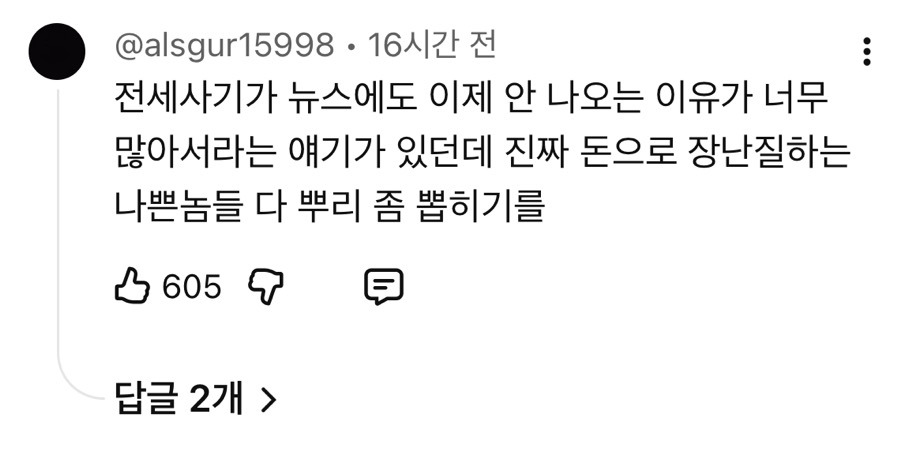 작성자아브라카다브랄라 작성시간 25.11.20 제발 나라에서 사기꾼 좀 제대로 처벌해 의식주 중에 주인데 이렇게 불안해하면서 사는게 맞냐고