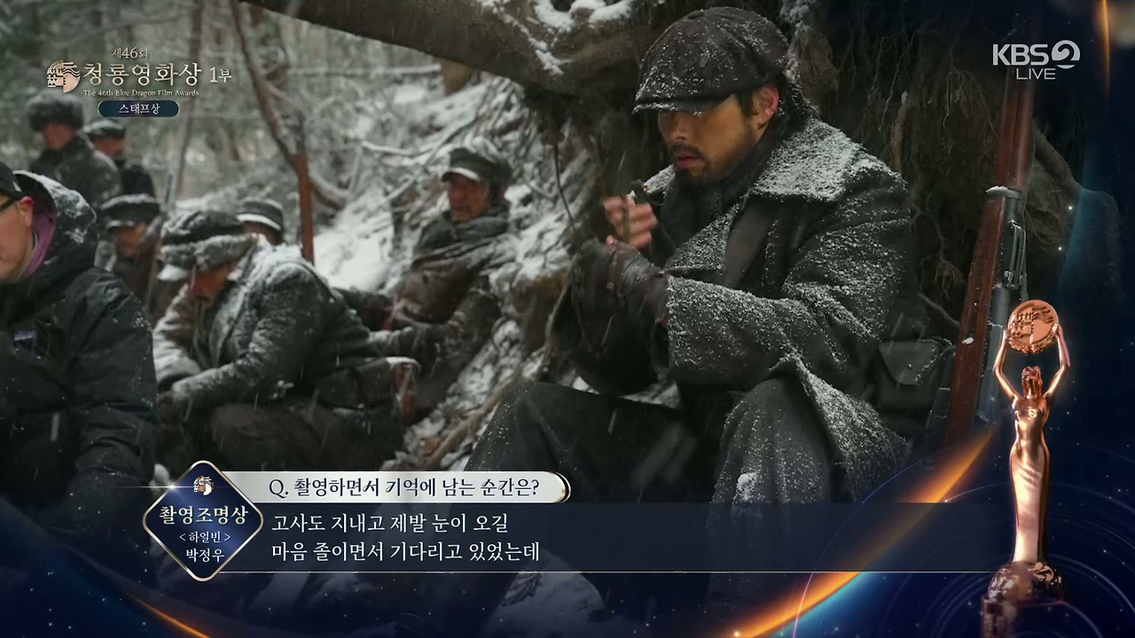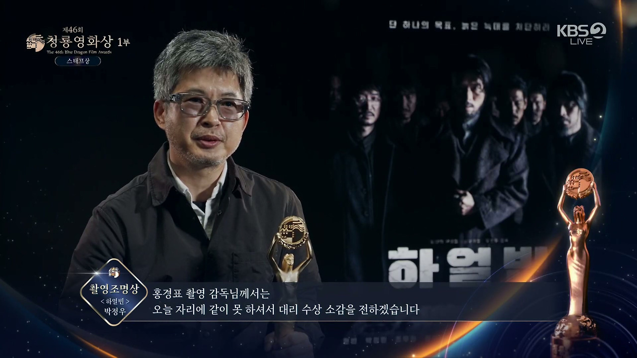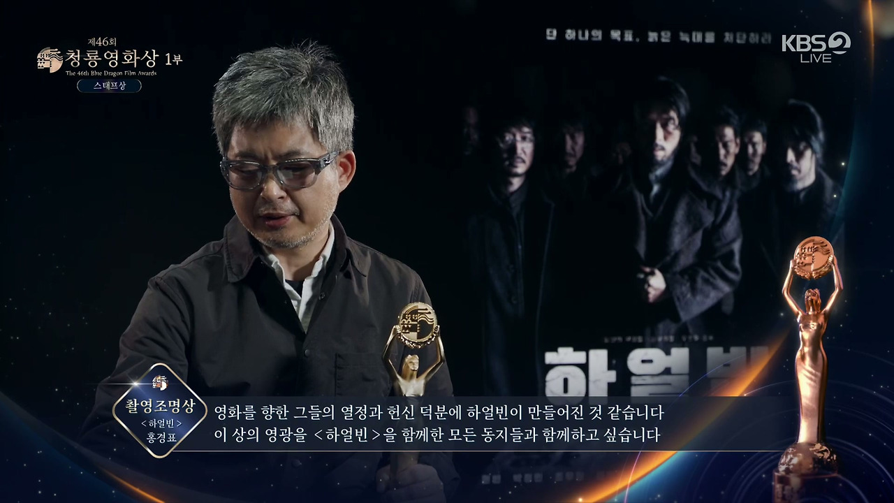 이날 영화 '하얼빈'의 홍경표 촬영감독이 영화 부문 대상을 수상했다. 다른 작품 촬영으로 참석하지 못한 홍경표 촬영감독을 대신해 제작사 하이브미디어코프 관계자는 "감독님께서 직접 감사의 말을 전했다"고 하며 "'하얼빈'은 한 겨울에 몽골, 라트비아, 한국의 추위와 강한 바람을 겪으며 고생했다. 제작자와 감독님, 배우분들, 스태프분들 모두 서로에게 동지애가 생겨 동지라고 부르며 힘들지만 즐겁게 촬영했다. 열정과 헌신을 함께한 동지들과 상의 영광과 기쁨을 함께 하겠다"고 전했다.