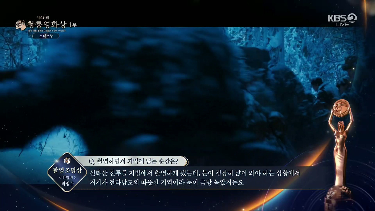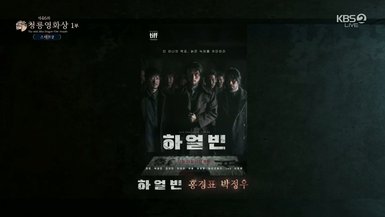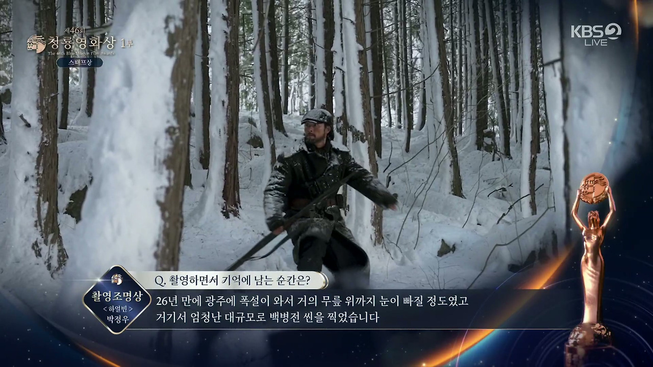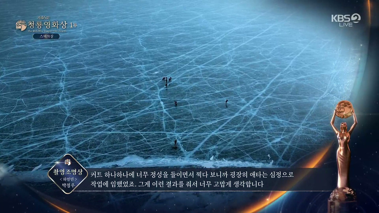 이날 영화 '하얼빈'의 홍경표 촬영감독이 영화 부문 대상을 수상했다. 다른 작품 촬영으로 참석하지 못한 홍경표 촬영감독을 대신해 제작사 하이브미디어코프 관계자는 "감독님께서 직접 감사의 말을 전했다"고 하며 "'하얼빈'은 한 겨울에 몽골, 라트비아, 한국의 추위와 강한 바람을 겪으며 고생했다. 제작자와 감독님, 배우분들, 스태프분들 모두 서로에게 동지애가 생겨 동지라고 부르며 힘들지만 즐겁게 촬영했다. 열정과 헌신을 함께한 동지들과 상의 영광과 기쁨을 함께 하겠다"고 전했다.