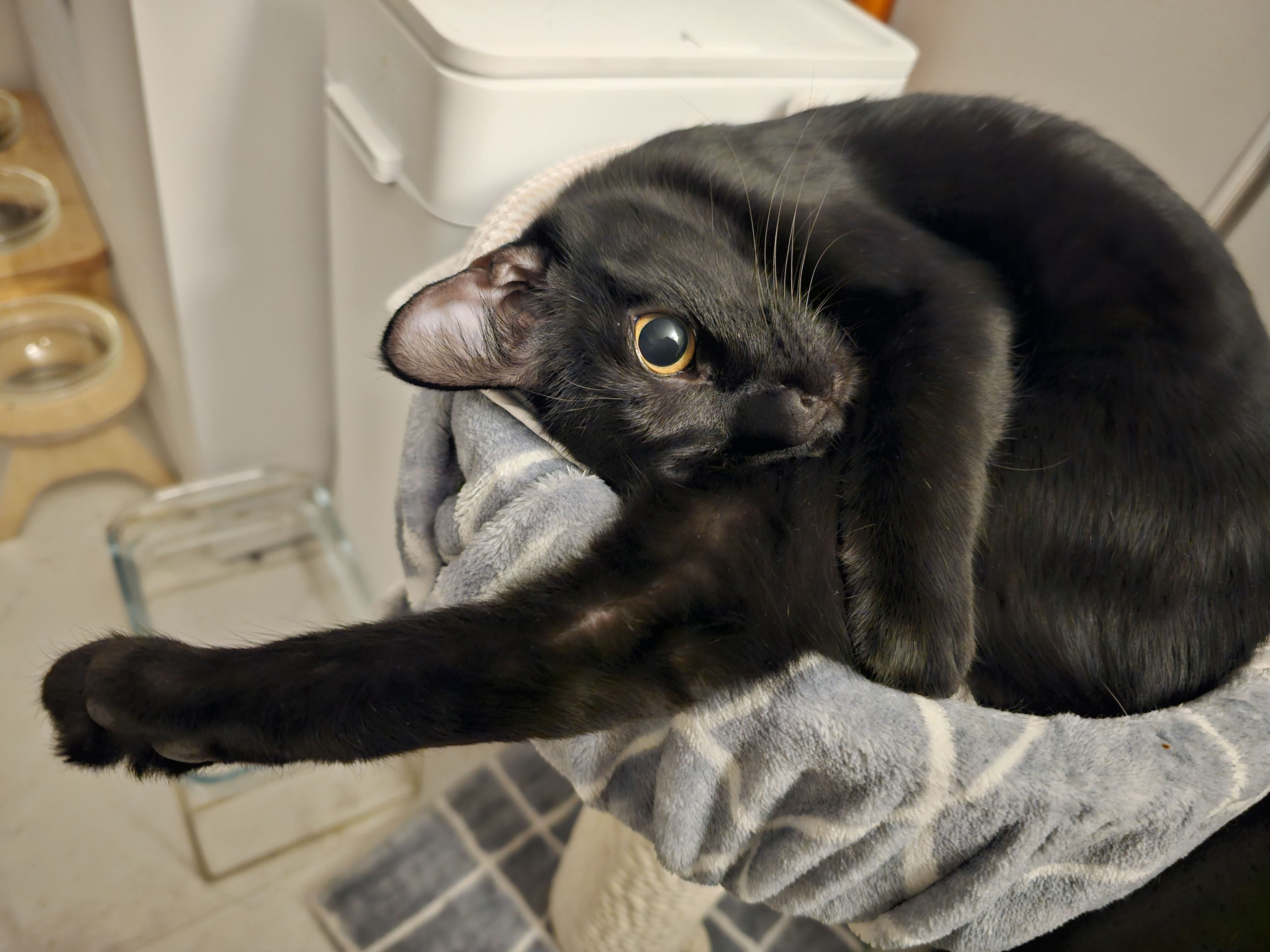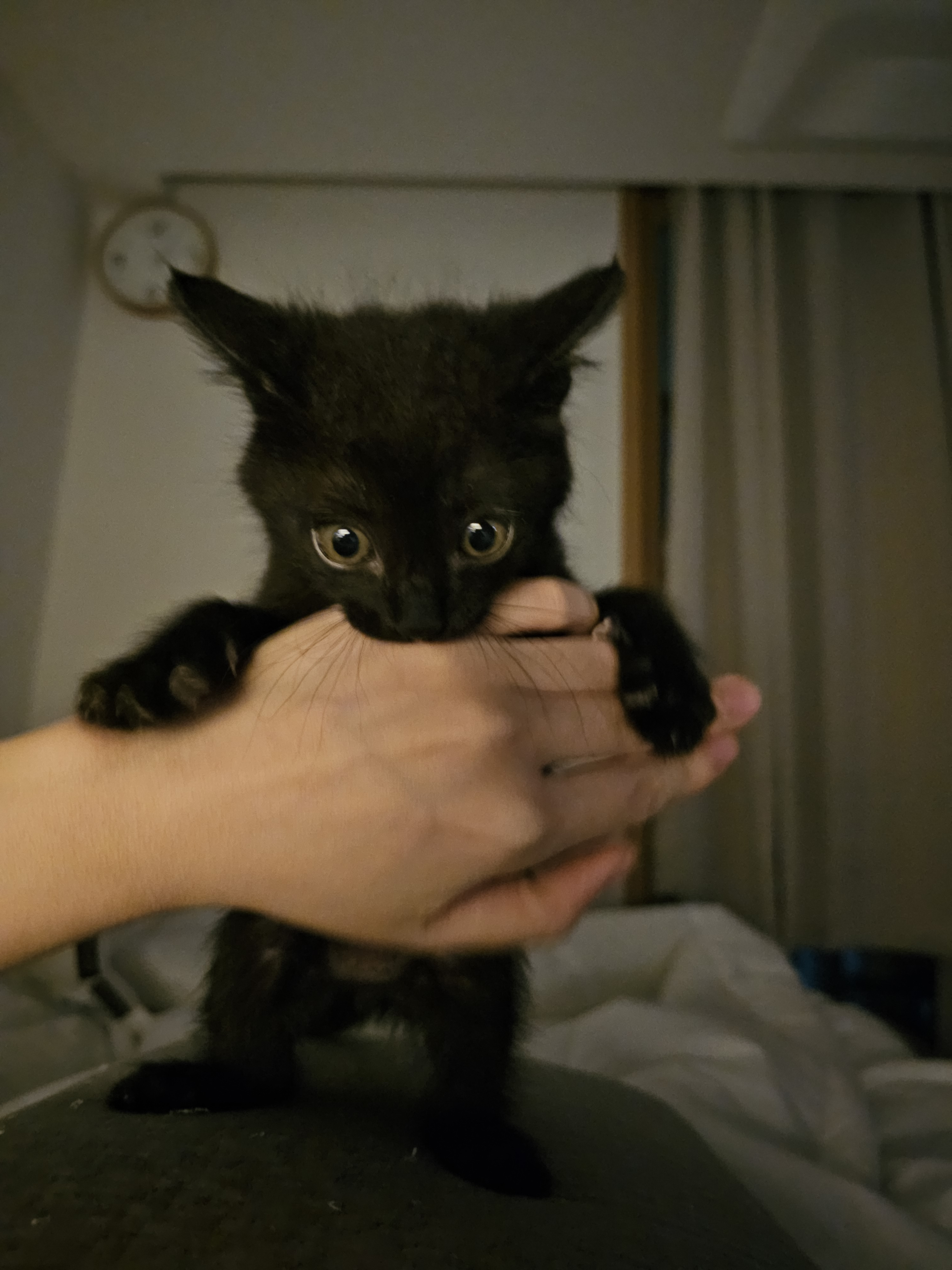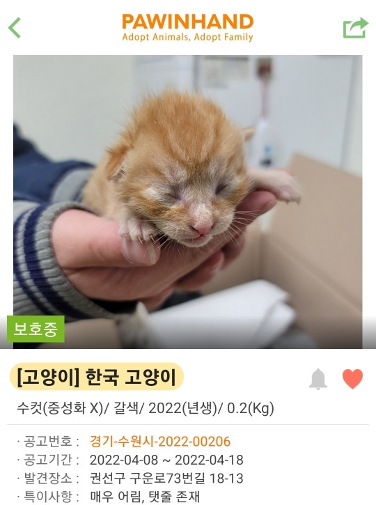 *부모님 가게에서 뒷다리 못쓰는 채로 어미한테 버려진 고양이 구출. 현재 생활하는데 지장은 없으나 자면서 오줌을 지리는 장애가 있음. 이불빨래 자주하고 오히려 좋아😉