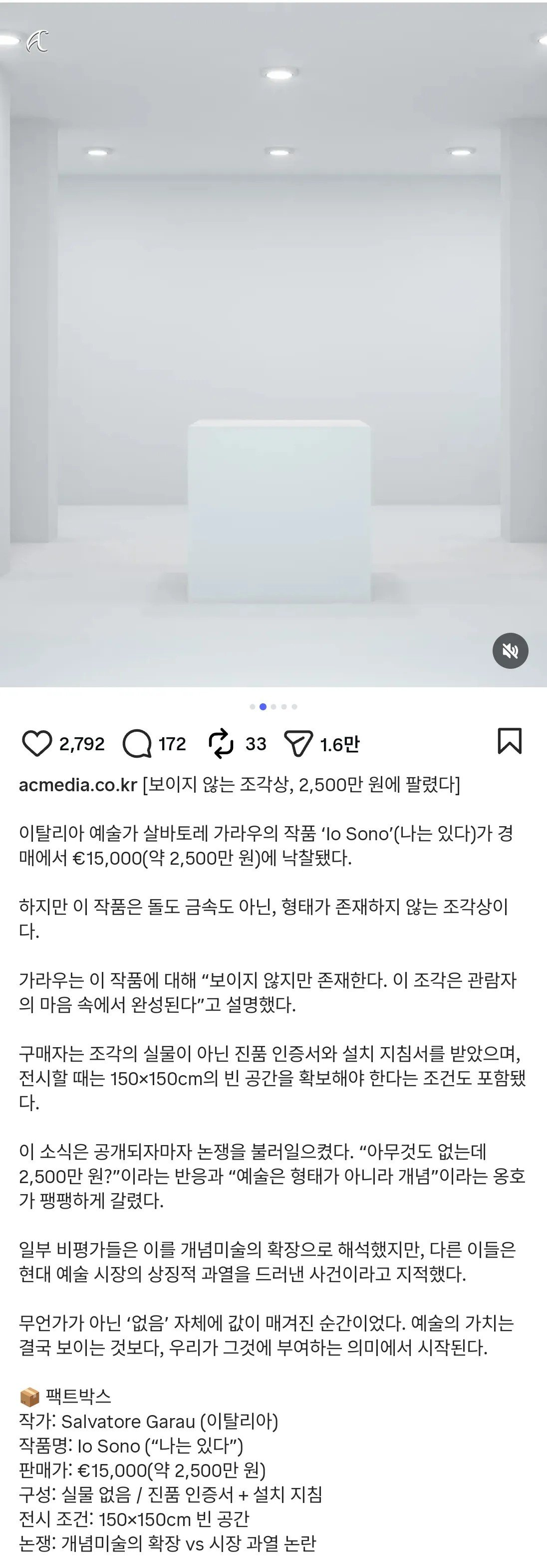 [흥미돋]2,500만원에 팔렸다는 조각상 ㄷㄷ 작성자밀크씨슬중독|작성시간25.11.20|조회수56,851 목록 댓글 50 글자크기 작게가 글자크기 크게가 출처: https://theqoo.net/square/3999383498더쿠 - 2,500만원에 팔렸다는 조각상 ㄷㄷtheqoo.net 조각상이라는 개념을 파는거지 다음검색 현재 게시글 추가 기능 열기 북마크 공유하기 신고 센터로 신고 댓글 댓글 50 댓글쓰기 답글쓰기 댓글 리스트 작성자푸방옹 | 작성시간 25.11.20 예술을 이딴거에 안붙으셨으면 함 작성자이것뭐에요?? | 작성시간 25.11.20 2500만원 투명으로 지불했읍니다 작성자칼마르크스 | 작성시간 25.11.20 변기에서 멈춰줘....어디까지 가!! 작성자내가생각하는대로 | 작성시간 25.11.21 실제 일반인에게 팔린게 아니라자기들끼리 짜고친거 아닐까유명한거로 유명해지려고 작성자샤랄랄랄라랄라 | 작성시간 25.11.21 예술을 입으로 하넼ㅋㅋㅋ 내가 너무 무지한가 댓글 전체보기