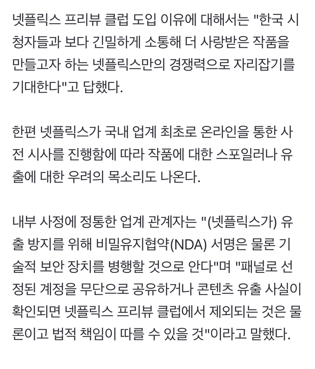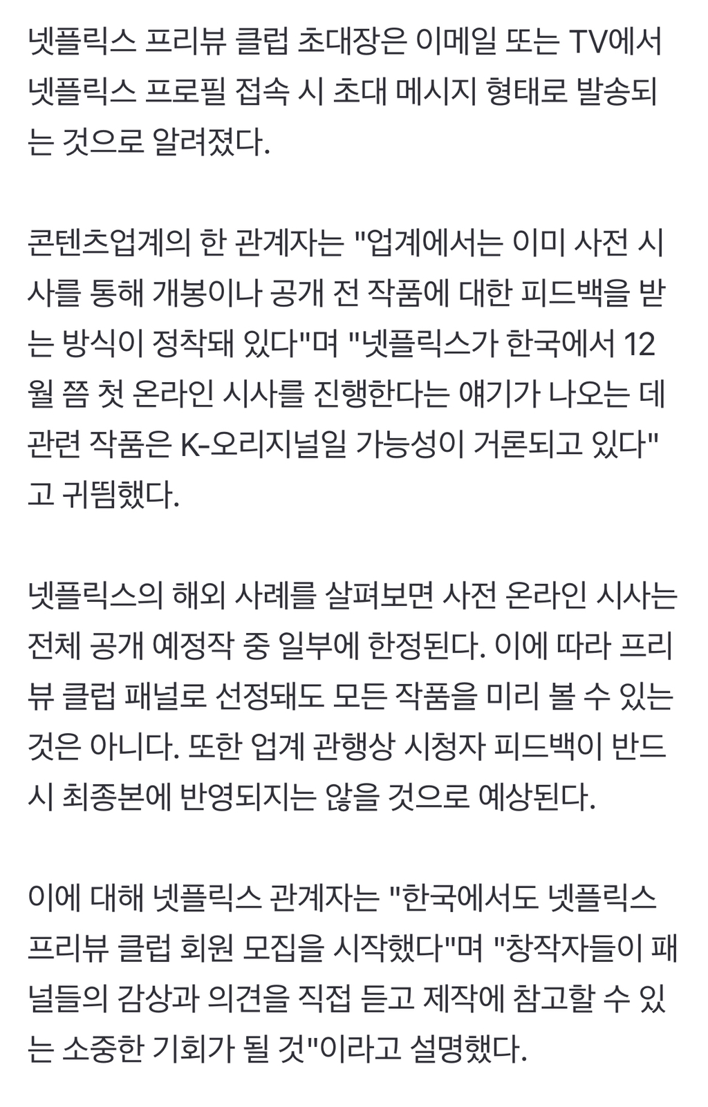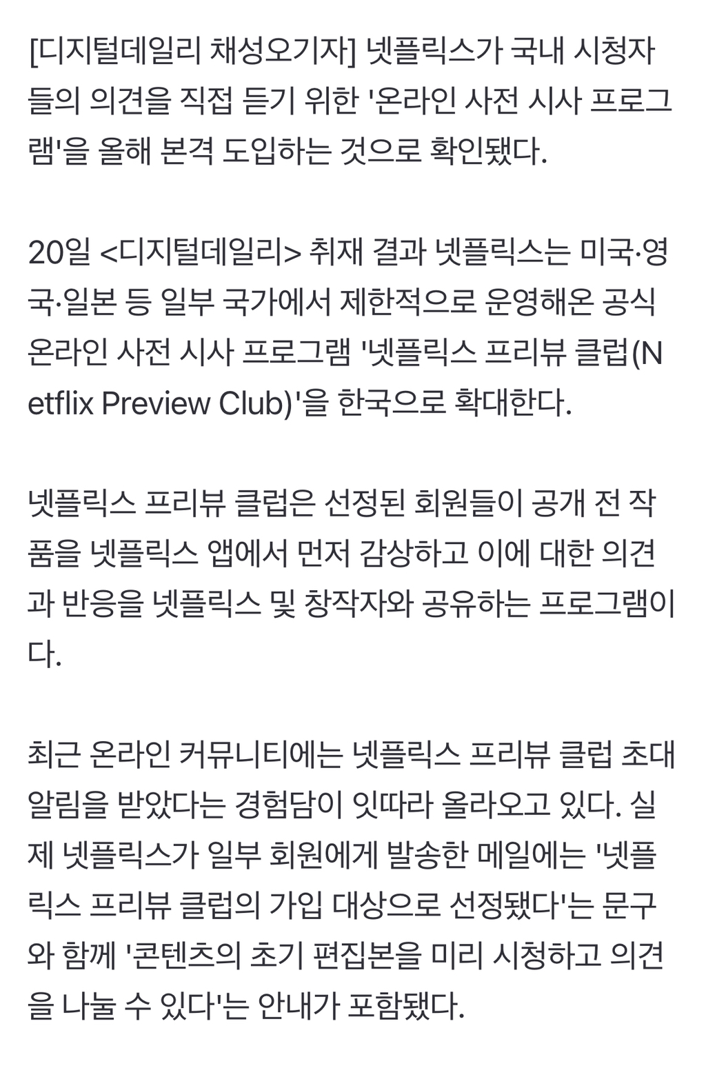 [여시뉴스데스크][단독] "신작 먼저 본다"…넷플릭스, 한국도 '프리뷰 클럽' 도입 작성자닉내임없어요|작성시간25.11.20|조회수3,983 목록 댓글 4 글자크기 작게가 글자크기 크게가 출처: https://n.news.naver.com/mnews/article/138/0002210204?sid=105[단독] "신작 먼저 본다"…넷플릭스, 한국도 '프리뷰 클럽' 도입넷플릭스가 국내 시청자들의 의견을 직접 듣기 위한 '온라인 사전 시사 프로그램'을 올해 본격 도입하는 것으로 확인됐다. 20일 <디지털데일리> 취재 결과 넷플릭스는 미국·영국·일본 등 일부 n.news.naver.com 다음검색 현재 게시글 추가 기능 열기 북마크 공유하기 신고 센터로 신고 댓글 댓글 4 댓글쓰기 답글쓰기 댓글 리스트 작성자올이줼 | 작성시간 25.11.20 프리티클럽으로 봣내 작성자대퉁퉁퉁령 재후르 | 작성시간 25.11.20 놀이공원 매직패스같은거 생각하고 파워네거티브 장착하고왔는데 그냥 시사회개념인거구나 특이하다 난 인도인이라서 못하겠군 작성자여기로오개 | 작성시간 25.11.20 기준이 뭘까 다양하게 많이 보는 사람이려나 작성자마루야ㅜㅜㅜㅜ | 작성시간 25.11.20 몇년지나면프리뷰클럽보다 더 빠르게 보는 vip프리뷰클럽제도를 시작합니다~~~~이럴듯 댓글 전체보기