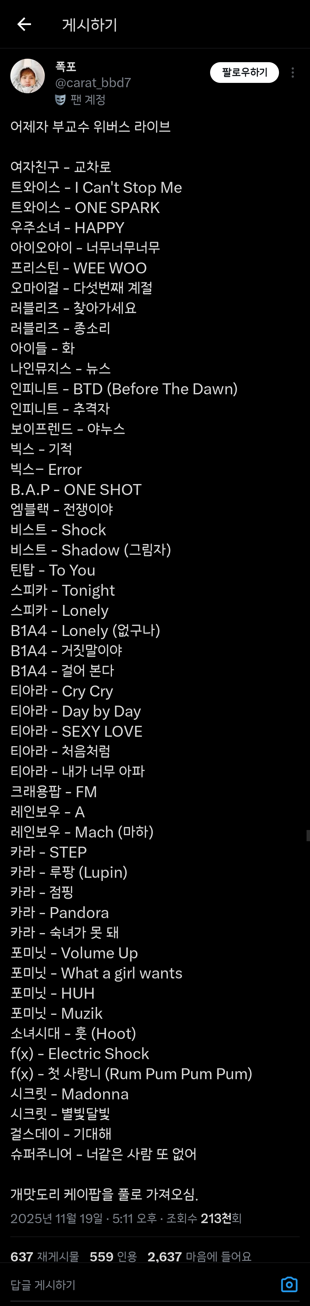 [흥미돋]부승관이 가져온 맛도리 케이팝 플리 작성자(본인 닉네임),|작성시간25.11.20|조회수9,782 목록 댓글 32 글자크기 작게가 글자크기 크게가 출처: 여성시대 (본인 닉네임),https://x.com/carat_bbd7/status/1991056721985614144?s=19 다음검색 현재 게시글 추가 기능 열기 북마크 공유하기 신고 센터로 신고 댓글 댓글 32 댓글쓰기 답글쓰기 댓글 리스트 작성자독도는우리땅이야 | 작성시간 25.11.21 이야 나도 러블리즈는 찾아가세요 라고 생각해 작성자뀨꺄꺼 | 작성시간 25.11.21 내 케이팝플리랑 비슷하다 ㅋㅋㅋㅋ 작성자HYBS | 작성시간 25.11.21 맛있다 작성자커비커비핑 | 작성시간 25.11.21 잘 끼려왔네 작성자대추 나무 사랑 걸렸네 | 작성시간 25.11.21 오 좋다 댓글 전체보기