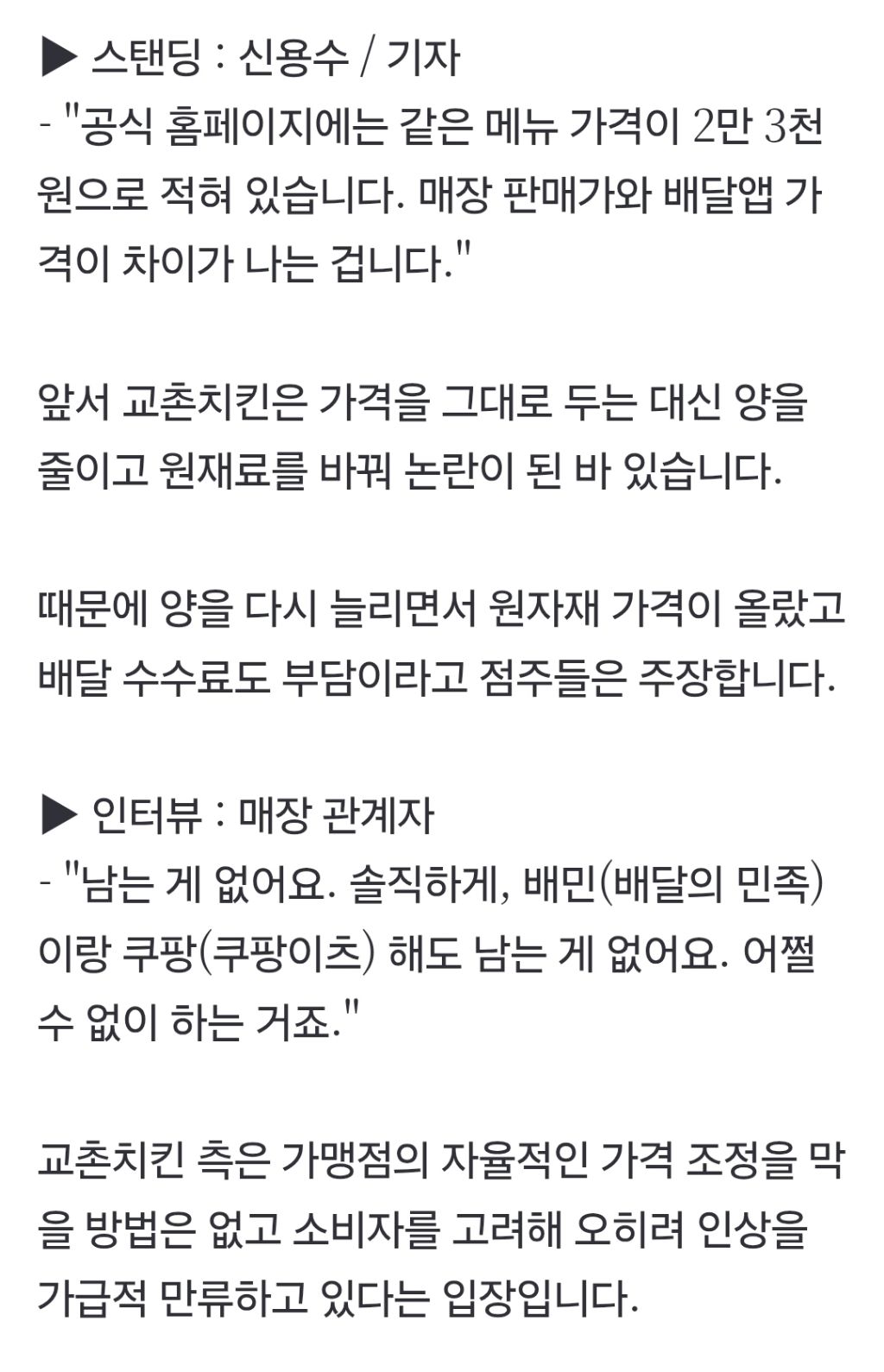 [여시뉴스데스크]'용량 줄여 뭇매' 교촌치킨, 이번엔 슬그머니 가격 인상…"배달앱 수수료 부담" 작성자나무콜렉터|작성시간25.11.20|조회수3,510 목록 댓글 18 글자크기 작게가 글자크기 크게가 출처: https://n.news.naver.com/article/057/0001919679?sid=101다른데는 치킨 어케 파냐그럼?왜맨날 교촌만 난리임 다음검색 현재 게시글 추가 기능 열기 북마크 공유하기 신고 센터로 신고 댓글 댓글 18 댓글쓰기 답글쓰기 댓글 리스트 작성자Nobel | 작성시간 25.11.20 웃겨 예전에 치킨집 배달비 받기 시작한거도 교촌이지?? 작성자굽네치킨은국힘꺼 | 작성시간 25.11.20 아씨ㅠ 언제 망해 작성자이럴때일수록운동 | 작성시간 25.11.20 와 가지가지 한다 진짜.. 저래도 사먹는다고..? 작성자돌마바흐체 | 작성시간 25.11.21 주변에 얘기하니까 그래도 맛있는걸 어케 이러더라..ㅋㅋㅋ 작성자느개비 최종학력와플대학 | 작성시간 25.11.21 교촌 안먹은지 몇년째인지.. 배달비 받을때부터 걍 안먹음ㅋ 댓글 전체보기