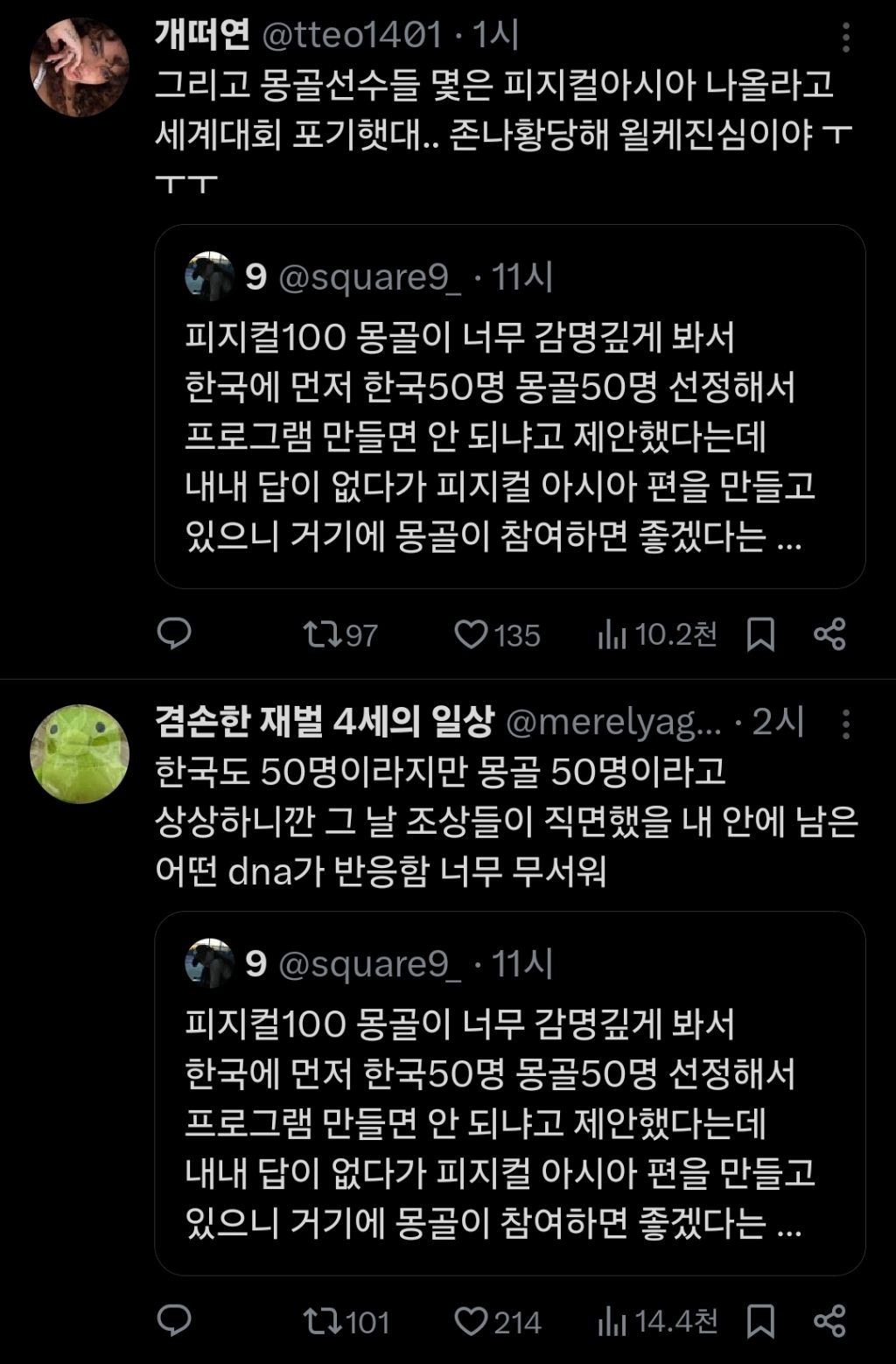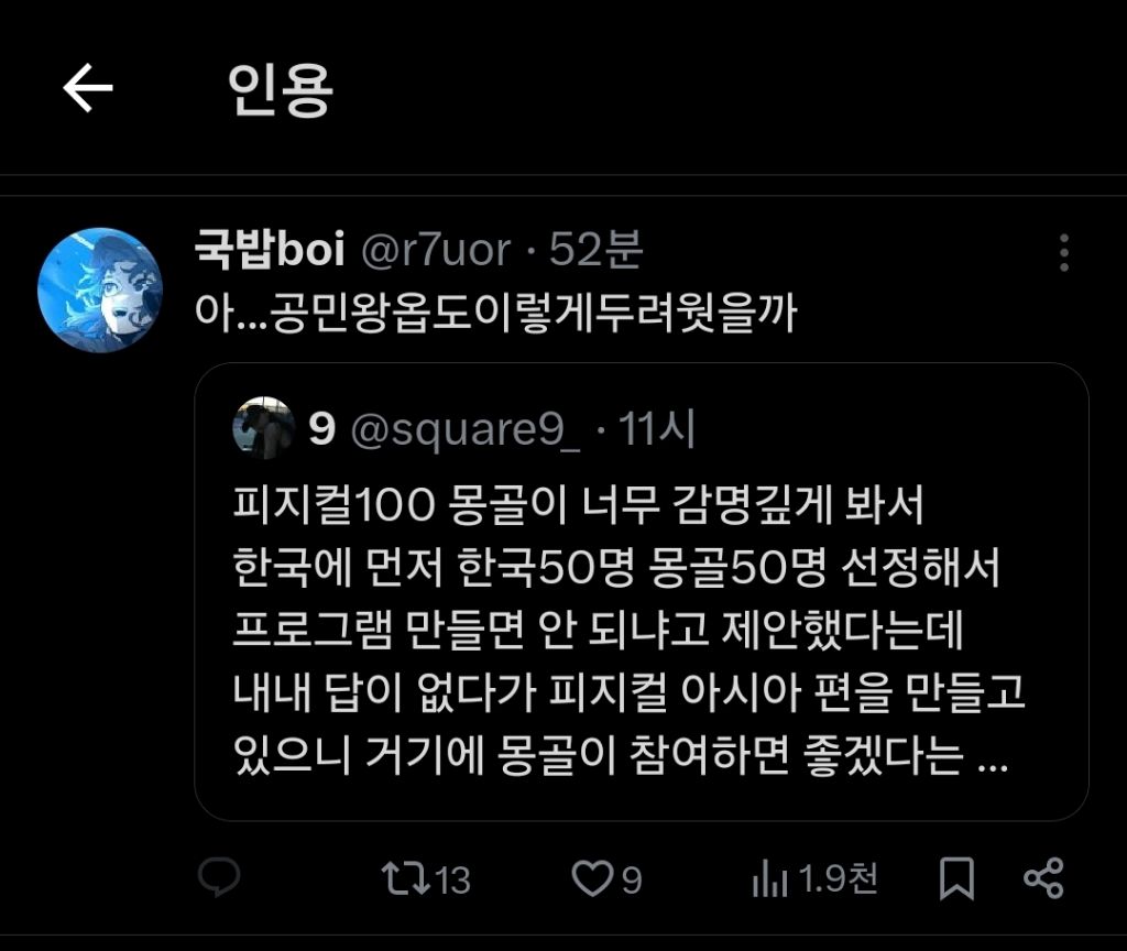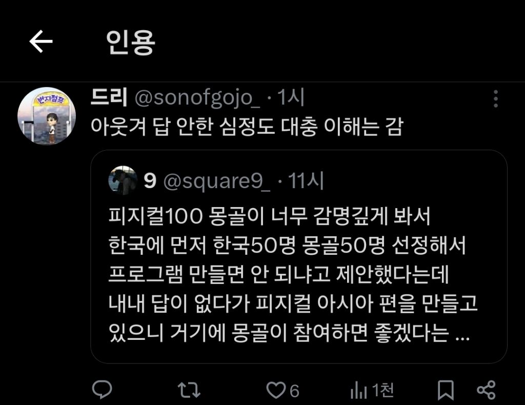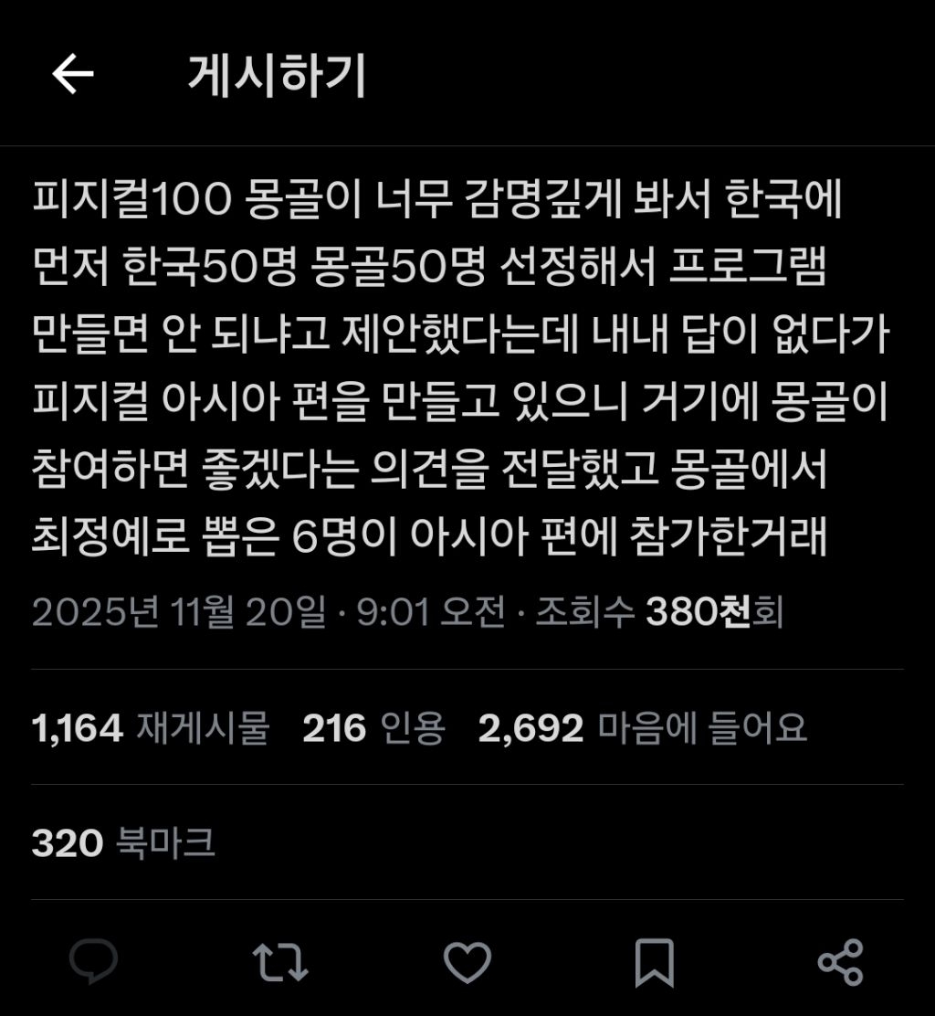[흥미돋]몽골이 한국에 먼저 한국50명 몽골50명 선정해서 프로그램 만들면 안 되냐고 제안했다는데 작성자ㅎㅈㄱㄷ|작성시간25.11.20|조회수29,236 목록 댓글 173 글자크기 작게가 글자크기 크게가 출처:https://x.com/square9_/status/1991295713943384364?t=SEYdgGOs0nRRWKXY_A2Axg&s=19 다음검색 현재 게시글 추가 기능 열기 북마크 공유하기 신고 센터로 신고 댓글 댓글 173 댓글쓰기 답글쓰기 댓글 리스트 작성자꾼쿱 | 작성시간 25.11.22 공민왕옵시밬ㅋㅋㅋ 작성자seeyouinmydream | 작성시간 25.11.22 세계대회를 포기..? 왜죠 작성자체크마카롱 | 작성시간 25.11.22 어르헝이 어떻게 50명이나 ㄷㄷㄷ 작성자스카이부 | 작성시간 25.11.22 너무무서워 50명이라니... 칭기즈칸 생각나서 지릴뻔했내 작성자이진 | 작성시간 25.11.22 몽! 댓글 전체보기
