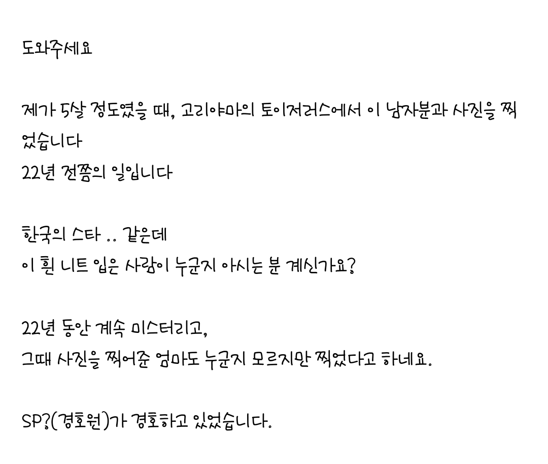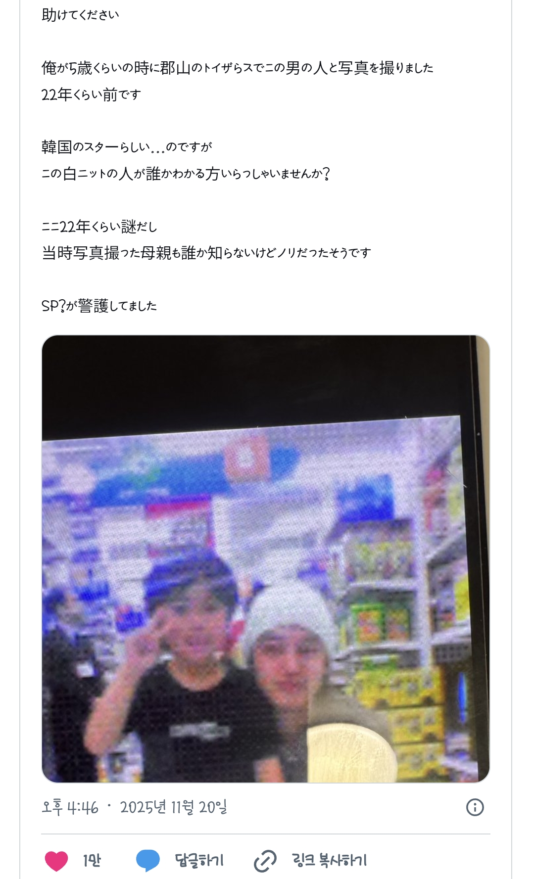 [흥미돋]22년 전에 한국의 스타 같은 분과 사진을 찍었는데 누군지 아는 사람 있나요.twt 작성자세 레나|작성시간25.11.20|조회수24,819 목록 댓글 86 글자크기 작게가 글자크기 크게가 출처: https://x.com/PaLarMigurdia/status/1991412745061999020김정훈?.. 누굴까ㅋㅋㅋ 다음검색 현재 게시글 추가 기능 열기 북마크 공유하기 신고 센터로 신고 댓글 댓글 86 댓글쓰기 답글쓰기 댓글 리스트 작성자체도 | 작성시간 25.11.21 소지섭! 작성자미끄러운춤 | 작성시간 25.11.21 그당시 아이돌아냐? 당시 아이돌들중에 저런 상 많았던것같은데 작성자해민이의도루교실 | 작성시간 25.11.21 김범인줄 작성자Jin Yun | 작성시간 25.11.22 나만 김광규...? 이랬네;;;;(((머쓱)))) 작성자정신차려험난한세상속에 | 작성시간 25.11.22 김범 댓글 전체보기