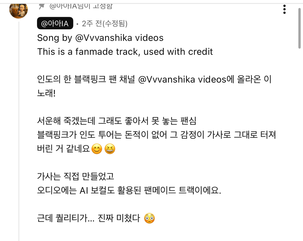 [흥미돋]블랙핑크가 인도에서 콘서트 해주면 좋겠음 작성자노C8킵고잉|작성시간25.11.20|조회수18,994 목록 댓글 17 글자크기 작게가 글자크기 크게가 출처: 유튜브, https://youtube.com/shorts/OW4yUj74fcA?si=94PLbDX5SeeqxQz9이 음악이 인트로면 개쩔거 같아서 다음검색 현재 게시글 추가 기능 열기 북마크 공유하기 신고 센터로 신고 댓글 댓글 17 댓글쓰기 답글쓰기 댓글 리스트 작성자아메리라노 | 작성시간 25.11.20 와원래잇는건줄 간지개쩔어 작성자암국 | 작성시간 25.11.21 와.. 작성자티니핑캐치핑 | 작성시간 25.11.21 대박이다 노래 너무좋은데? 작성자상식적인 개10갑부 | 작성시간 25.11.21 오 노래랑 가사 좋은데??이제 진짜 ai가 다 잘 만들 수 있겠구나 작성자헤이댓츠미 | 작성시간 25.11.21 고퀄이다 댓글 전체보기