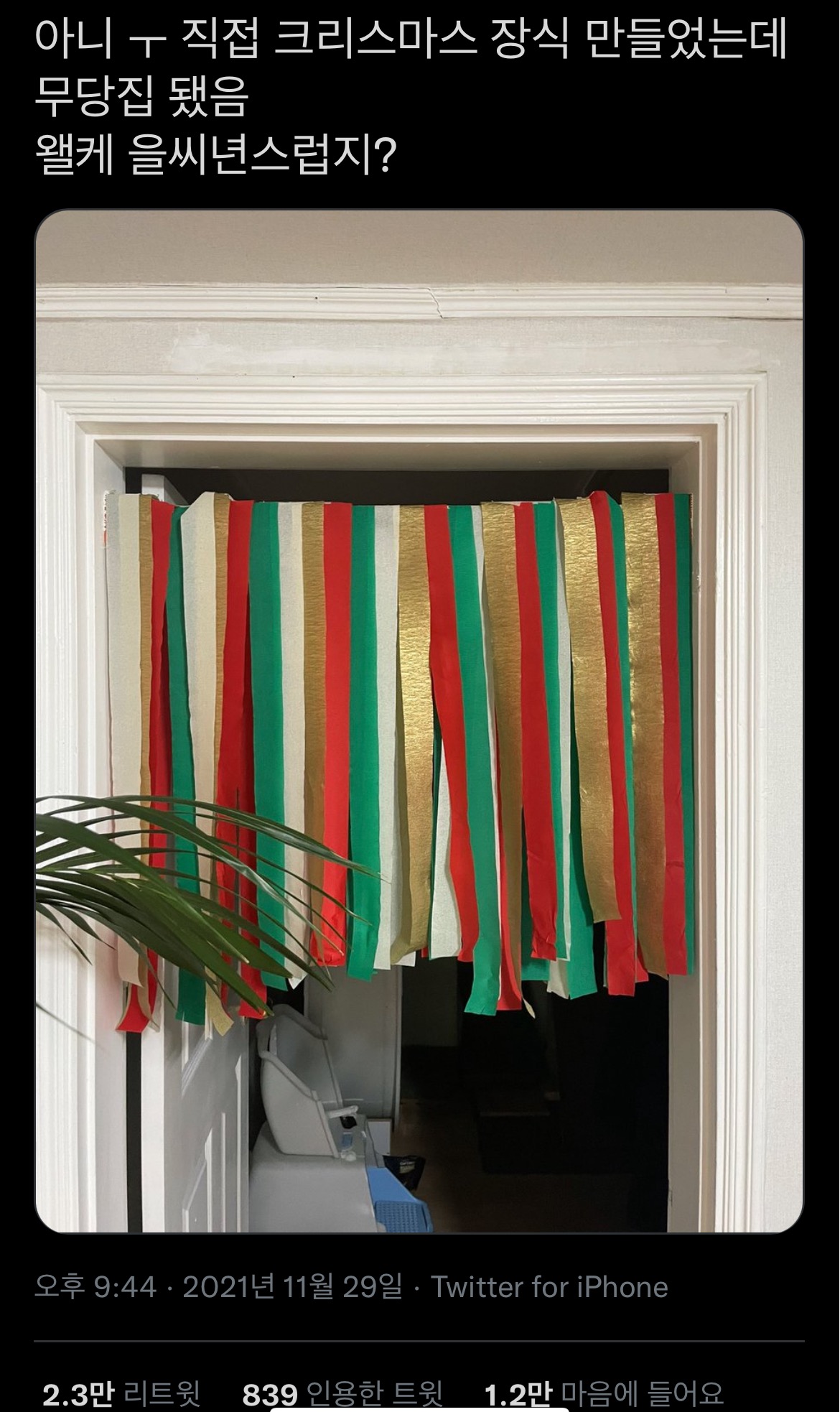 [스크랩] [흥미돋]아니 ㅜ 직접 크리스마스 장식 만들었는데...twt 작성자비혼주의다|작성시간25.11.20|조회수35,253 목록 댓글 54 글자크기 작게가 글자크기 크게가 출처 : https://twitter.com/birdprofilepic/status/1465300647658491906?s=20극복함 다음검색 스크랩 원문 : *여성시대* 차분한 20대들의 알흠다운 공간 현재 게시글 추가 기능 열기 북마크 공유하기 신고 센터로 신고 댓글 댓글 54 댓글쓰기 답글쓰기 댓글 리스트 작성자김혜성가만안둬 | 작성시간 25.11.21 불....불을꺼보자ㅜ 작성자천상여언 | 작성시간 25.11.21 색이 묘하게 바랜 색이다 ㅋㅋㅋ 작성자오빠!살려주시오 | 작성시간 25.11.21 흰색을 빼야함 작성자쏘굴 | 작성시간 25.11.21 전구를 달아야하나? 작성자안뇽허생스 | 작성시간 25.11.22 천 면적이 너무 좁아 댓글 전체보기